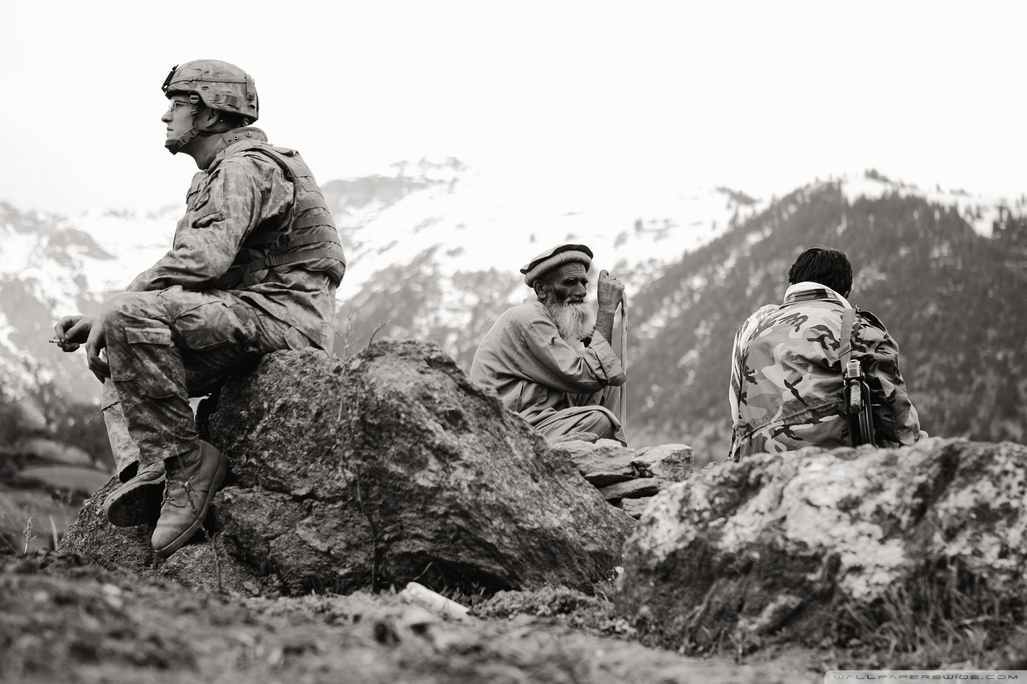 Description: A group of men sitting on top of a rock covered hillside next to a mountain range with snow covered mountains in the background.