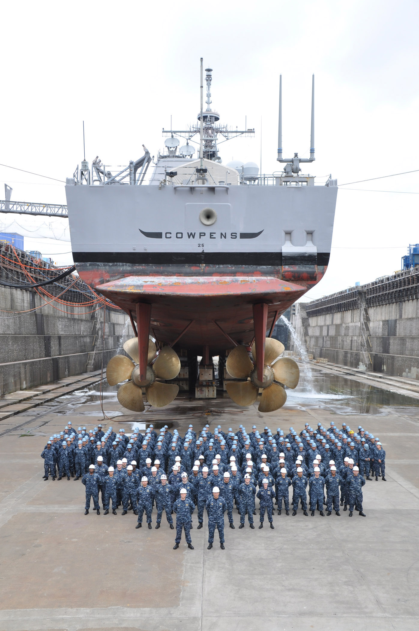 Description: A group of men standing in front of a large ship in a dry dock area with a large propeller.