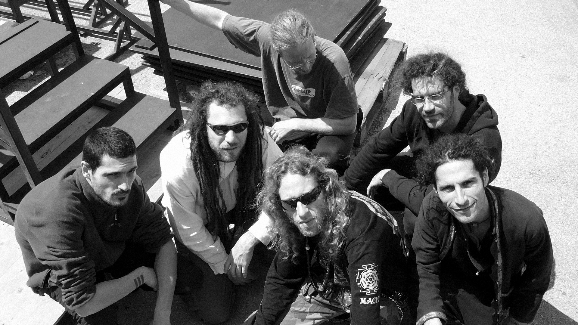 Description: A group of men sitting next to each other on a sidewalk next to stairs and stairs with one man pointing at the camera.