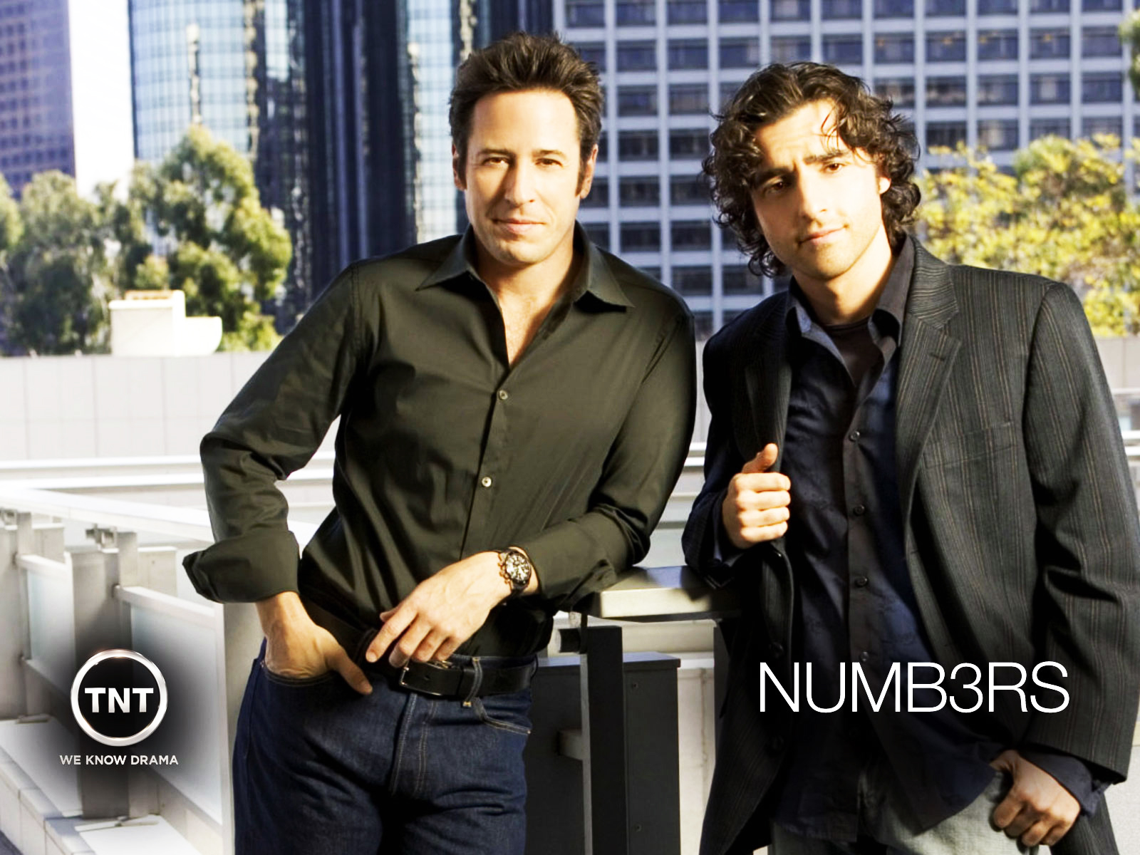 Description: Two men standing next to each other in front of a building with a city skyline in the background and a number 8 sign.