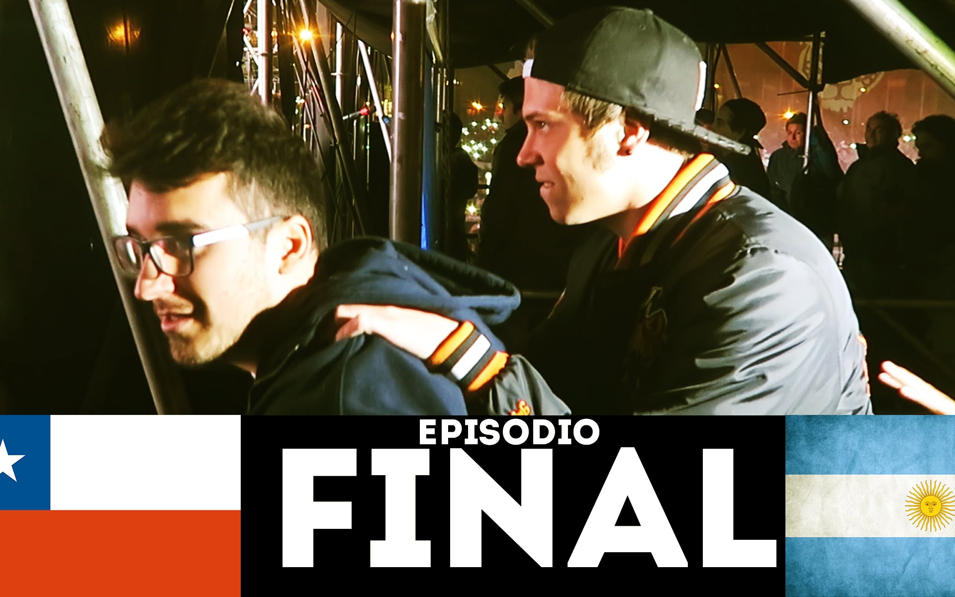 Description: Two men are standing together in front of a flag and a banner with the words final written in spanish.