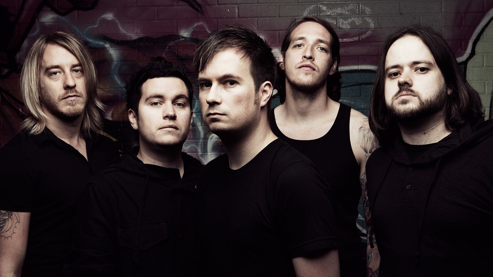 Description: A group of men standing next to each other in front of a wall with graffiti on it and one man looking up.