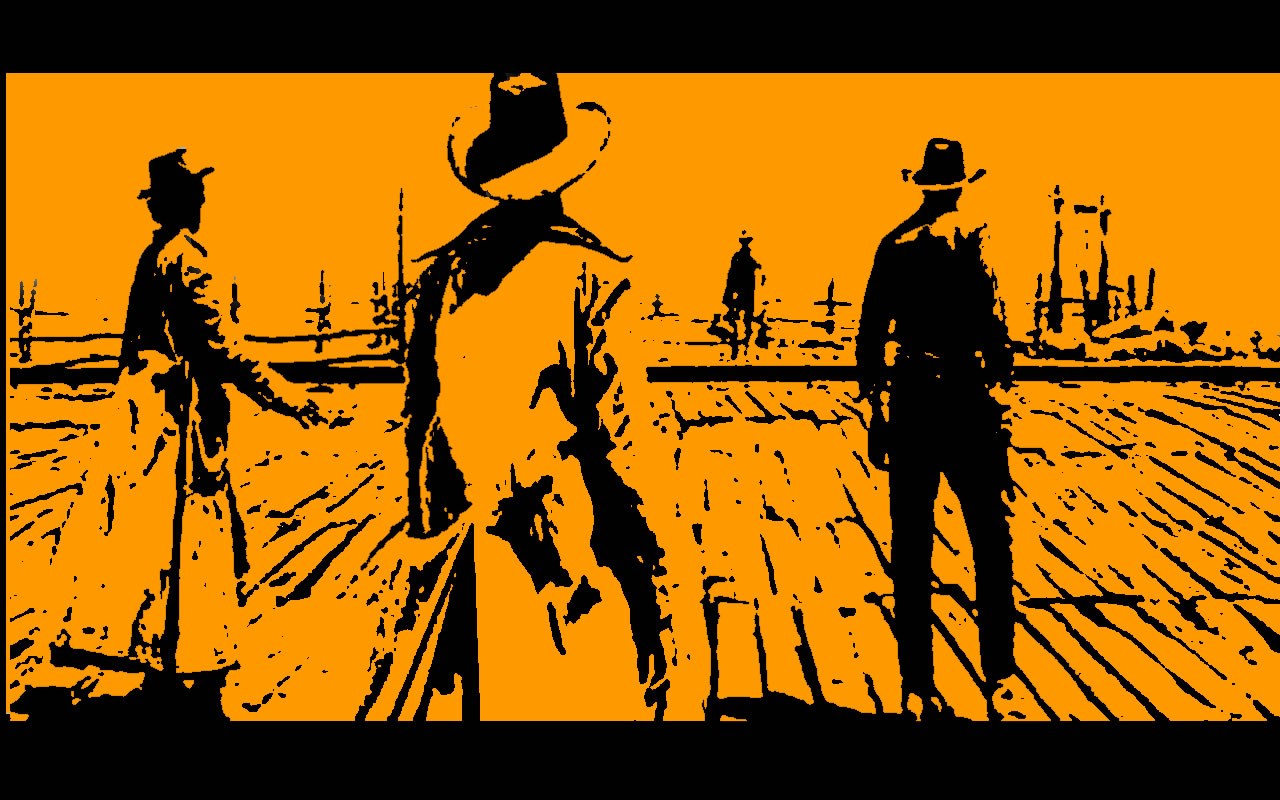 Description: A couple of men standing next to each other on a wooden floor in front of a yellow sky with a black border.