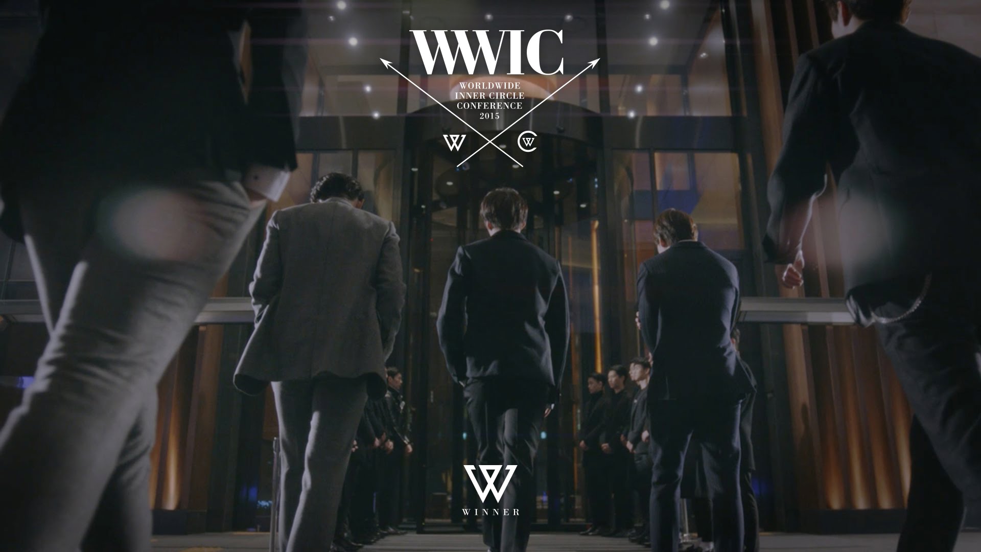 Description: A group of men in suits walking down a hallway together with a wwc logo on the wall behind them.