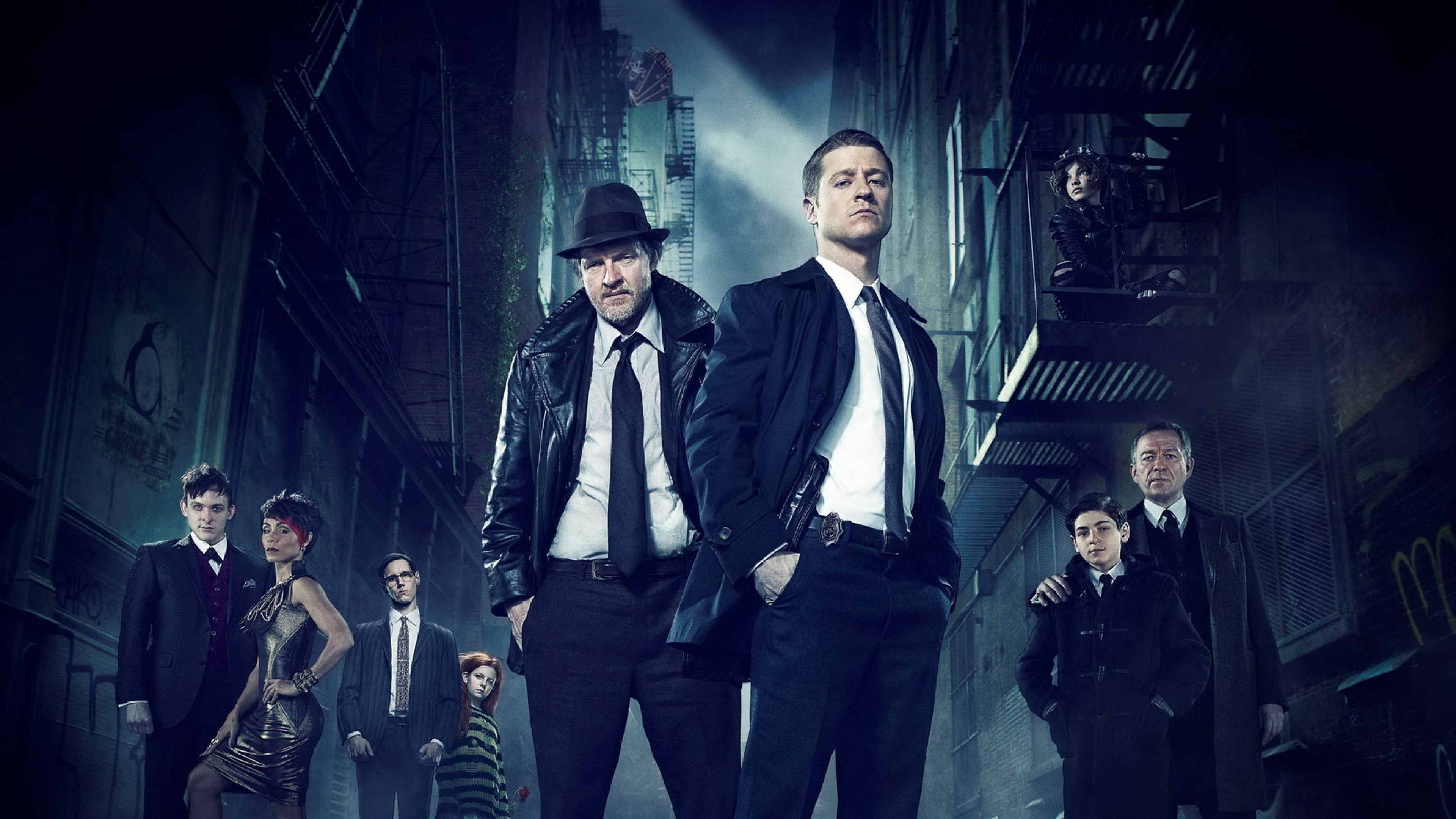 Description: A group of men in suits and ties standing in a dark alleyway with a city background in the background.