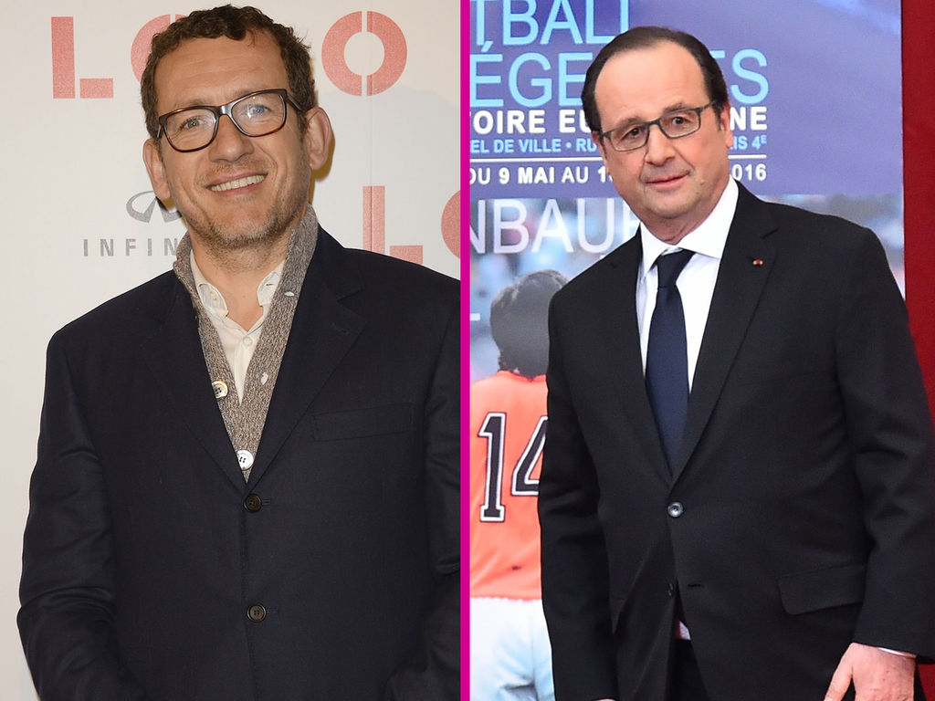 Description: Two men in suits and ties standing next to each other in front of a red wall and a poster.