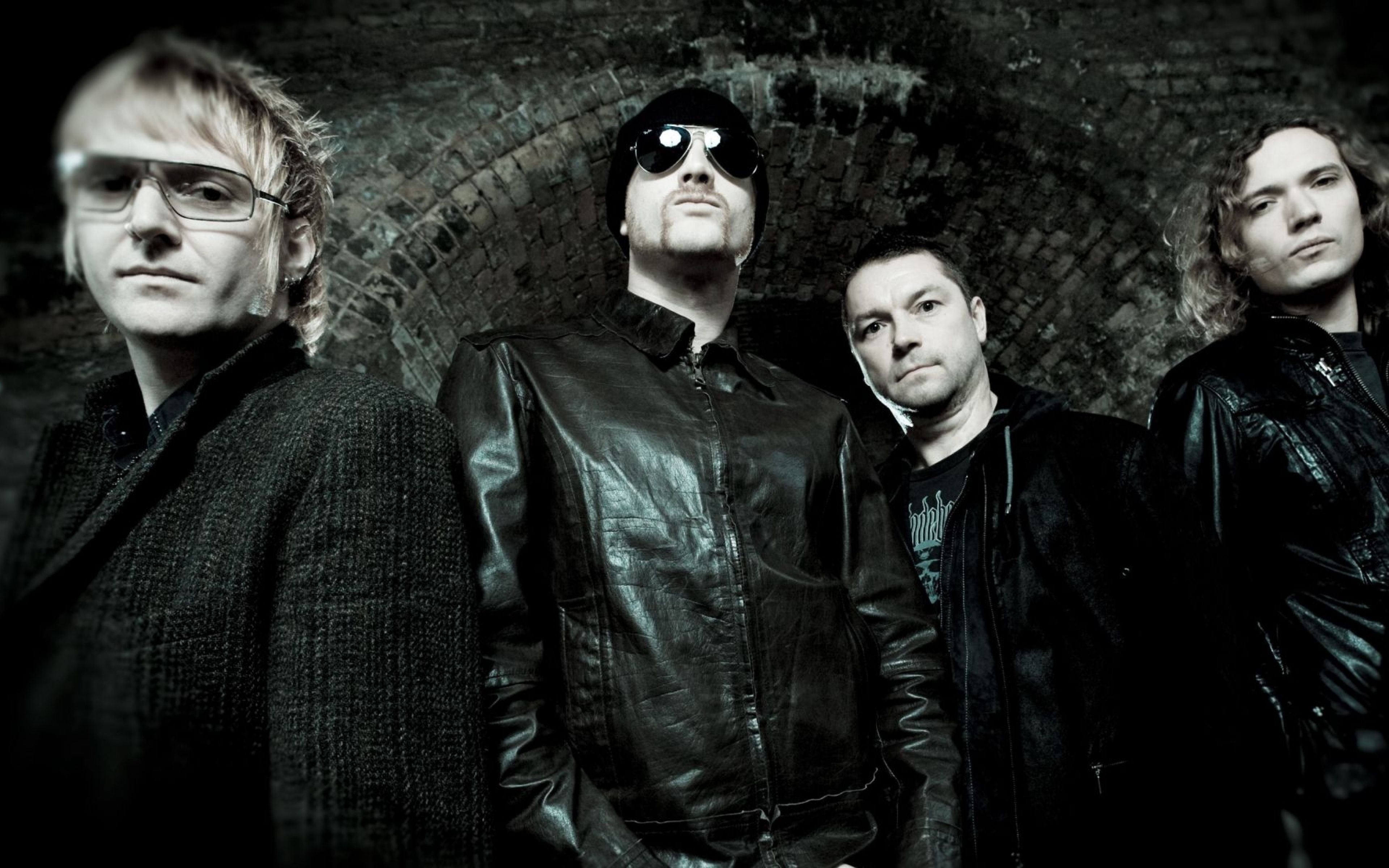 Description: A group of men standing next to each other in front of a brick wall with sunglasses on their faces.
