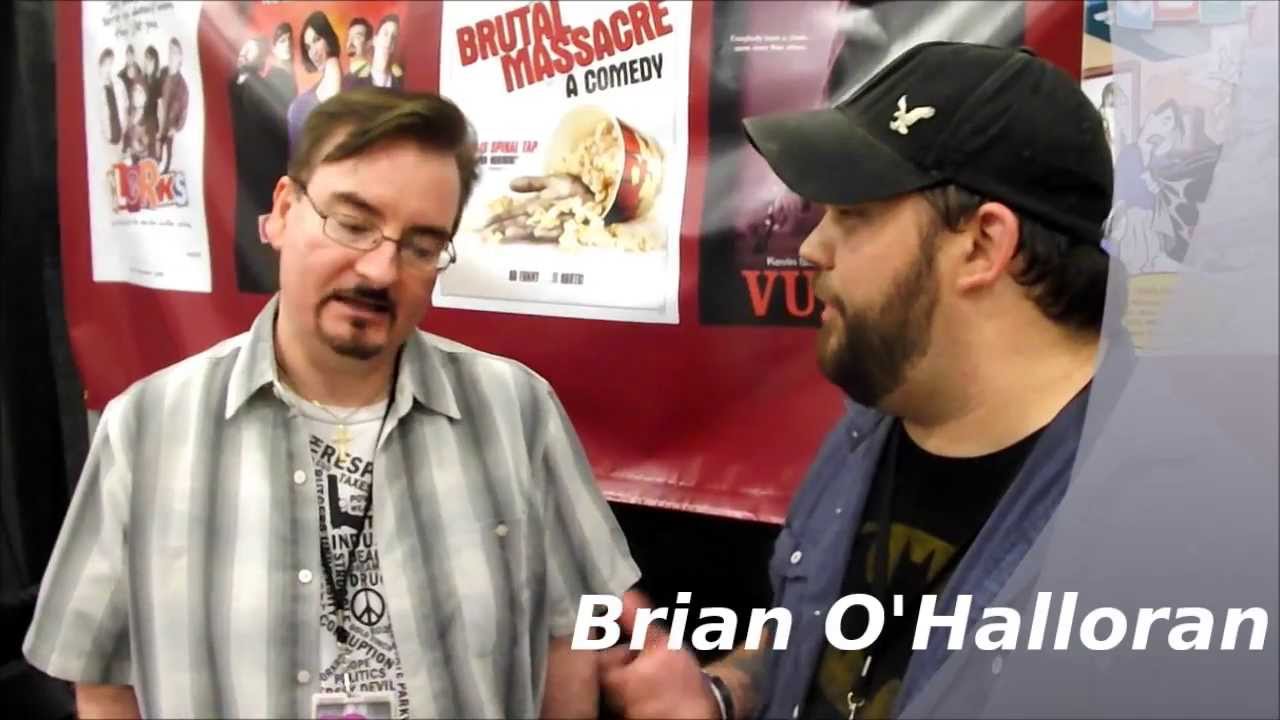 Description: Two men are talking to each other in front of a poster of a movie poster and a poster of a movie.