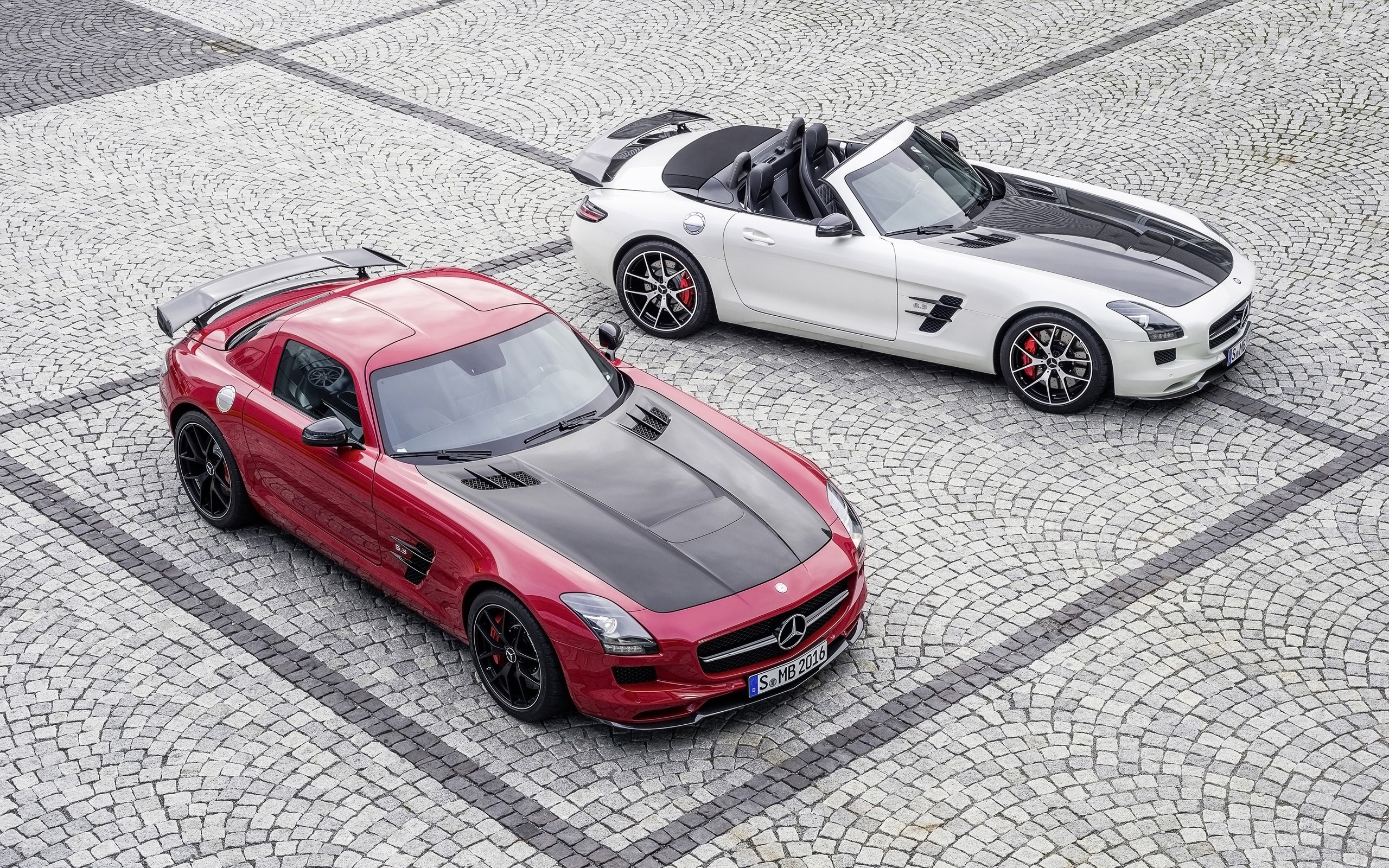 Description: Two mercedes sls parked on a cobblestone surface with a roof down and a top down view of the two cars.
