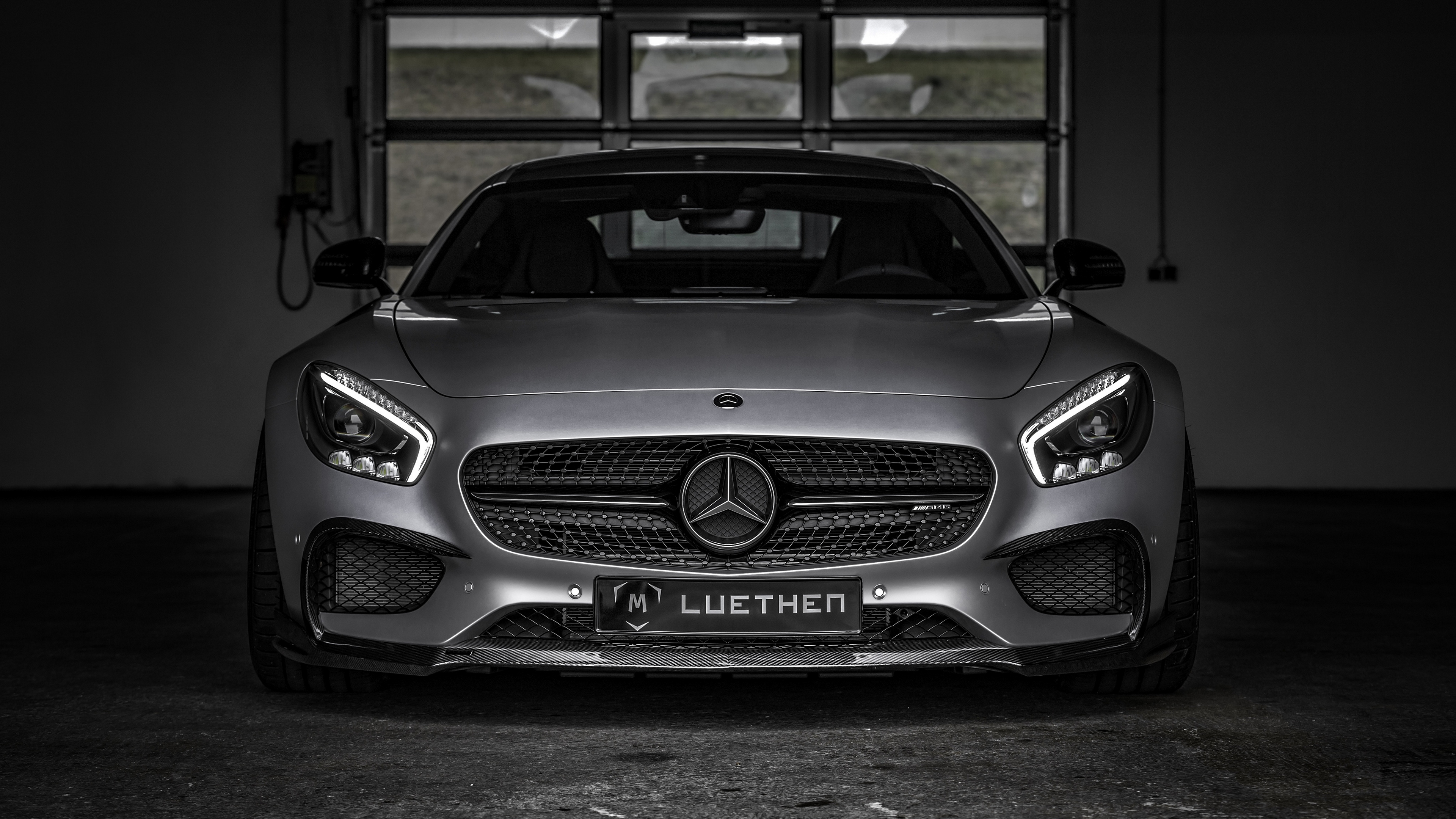 Description: A mercedes benz sports car parked in a garage with its hood open and the hood up open.