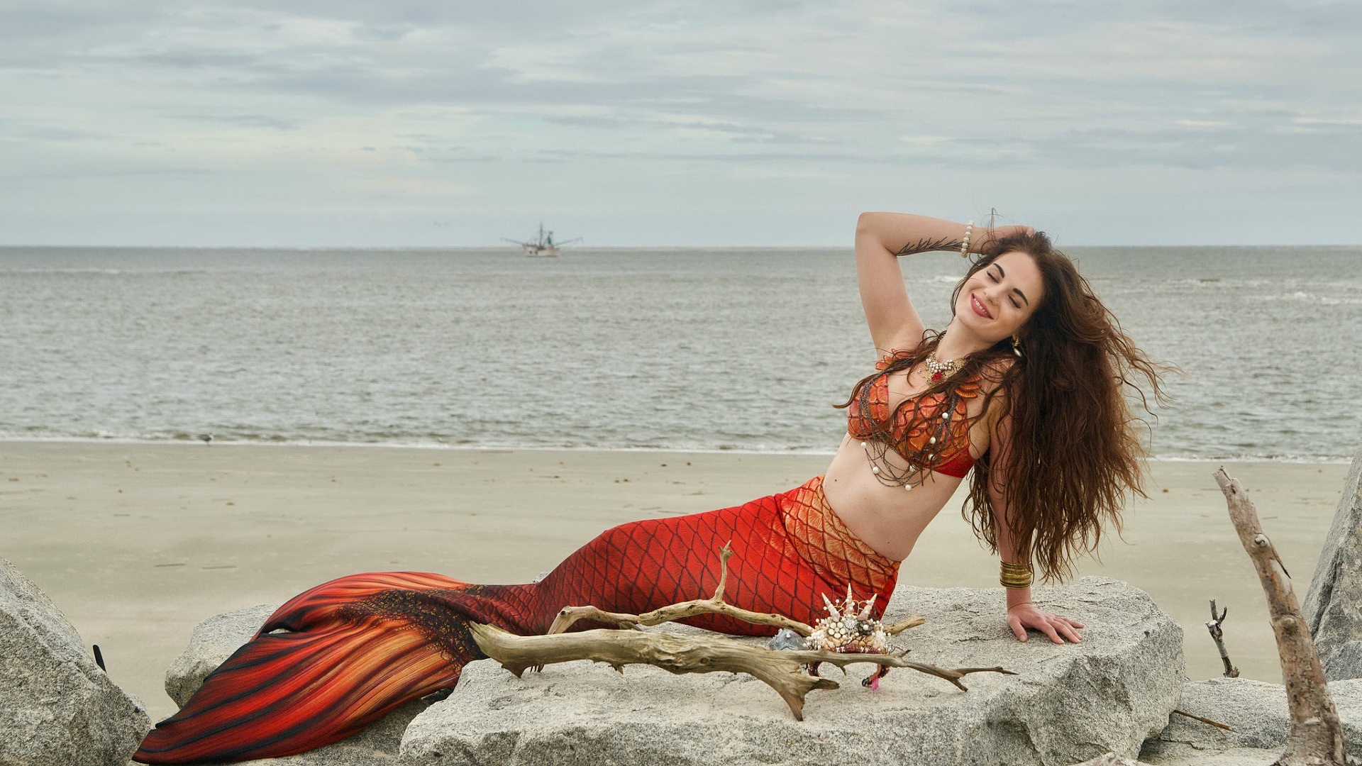 Description: A woman in a red and orange mermaid costume laying on a rock on the beach with a ship in the background.