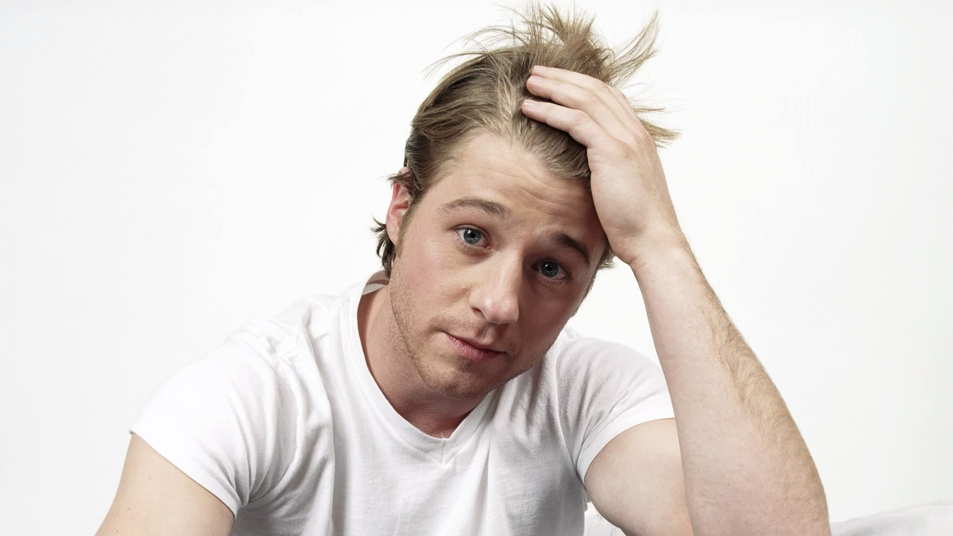 Description: A man with a messy hair sitting down with his hands on his head and looking at the camera with a serious look on his face.