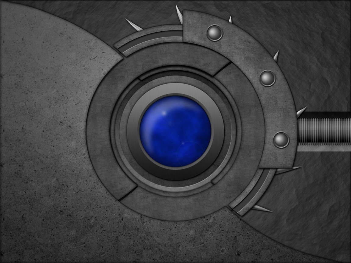 Description: A metal object with a blue center surrounded by metal spikes and rivets on a gray background with a black border.