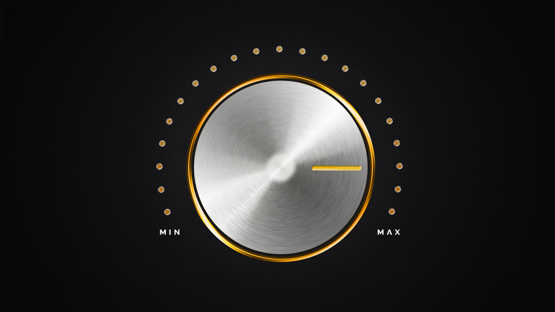 Description: A metal clock with a yellow line on it's face and a black background with dots around it.