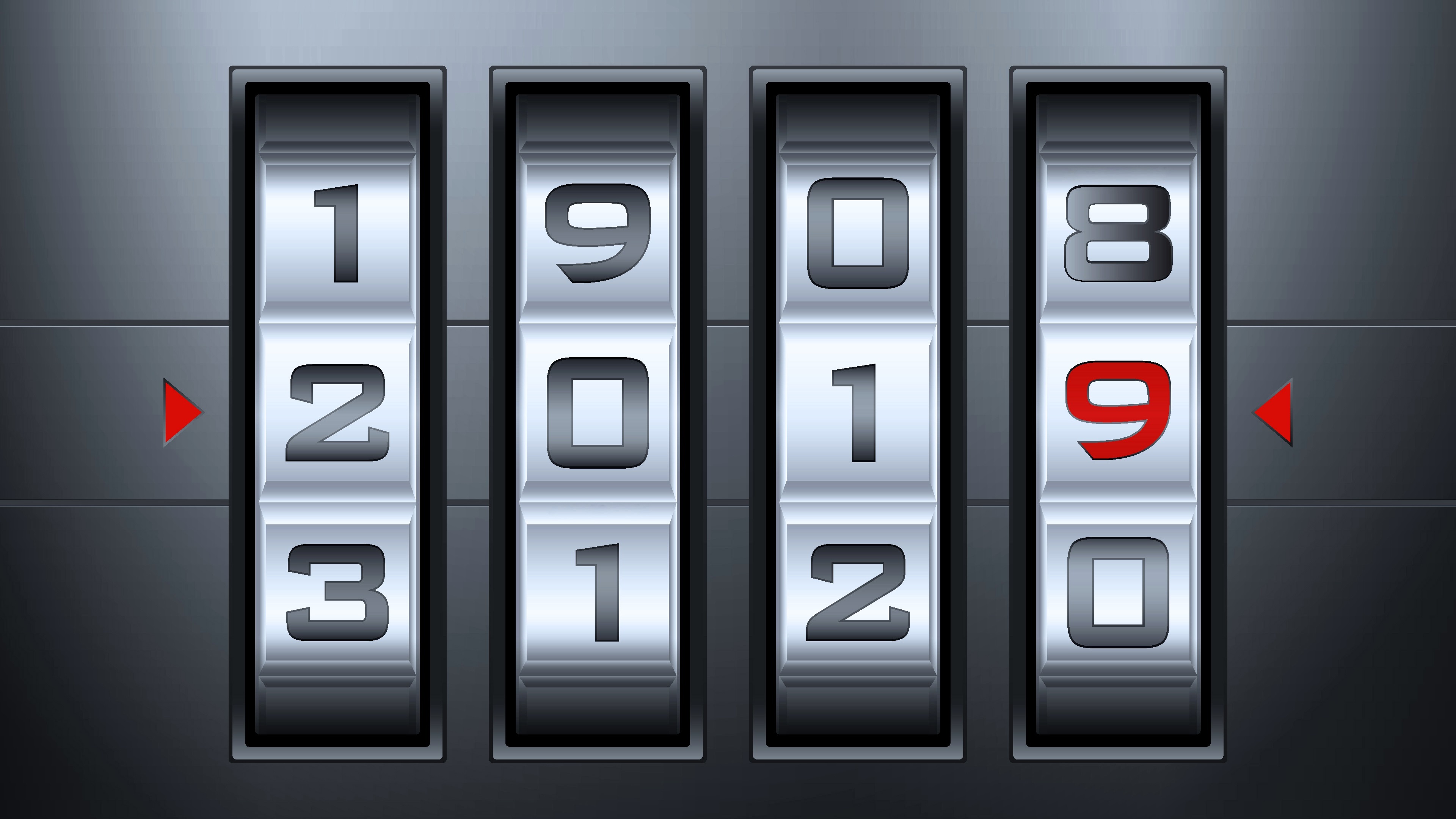 Description: A metal lock with numbers on it and arrows pointing to the left side of the lock.