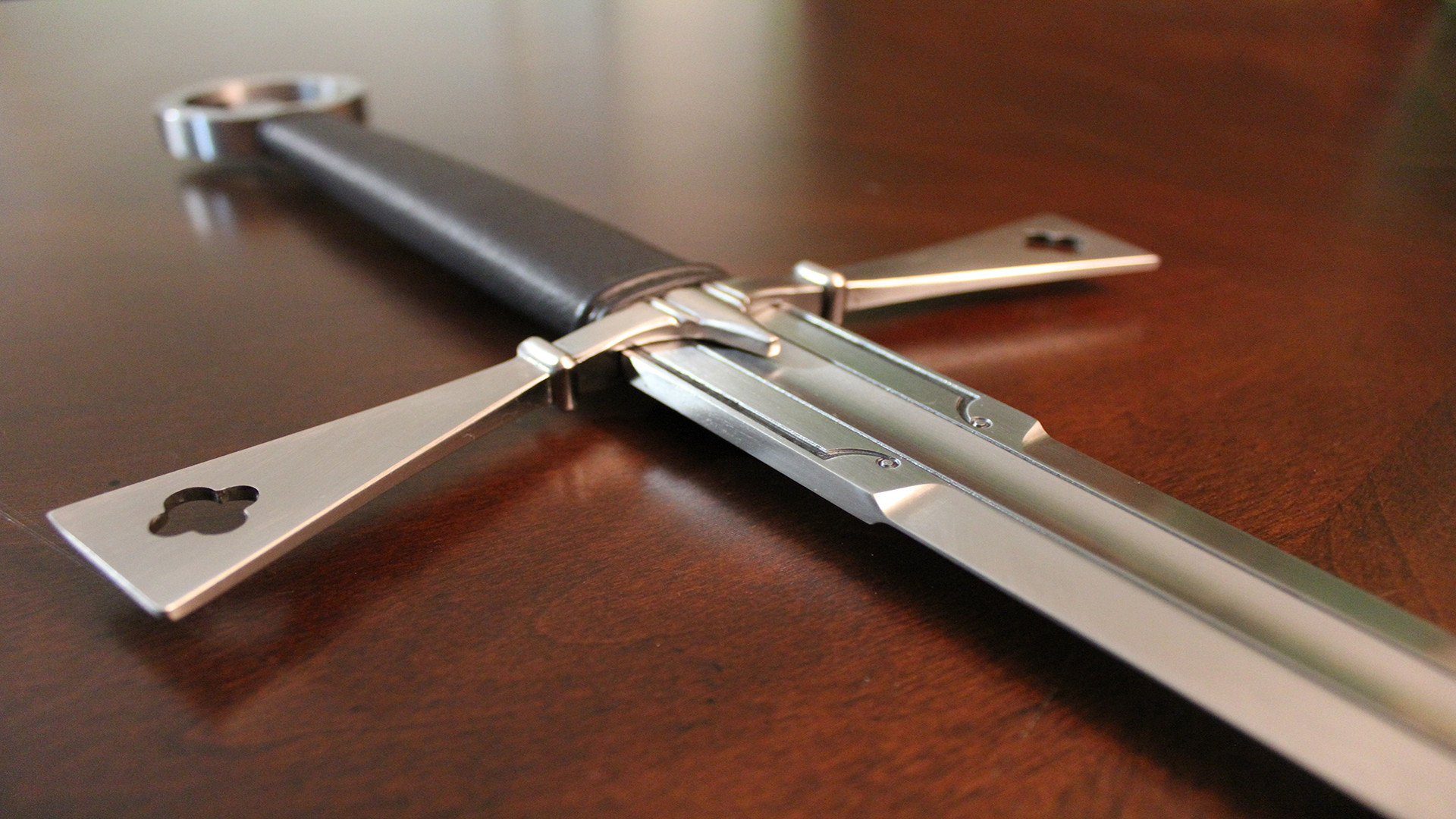 Description: A metal object on a wooden table with a metal handle on it's end and a metal apple logo on the side.