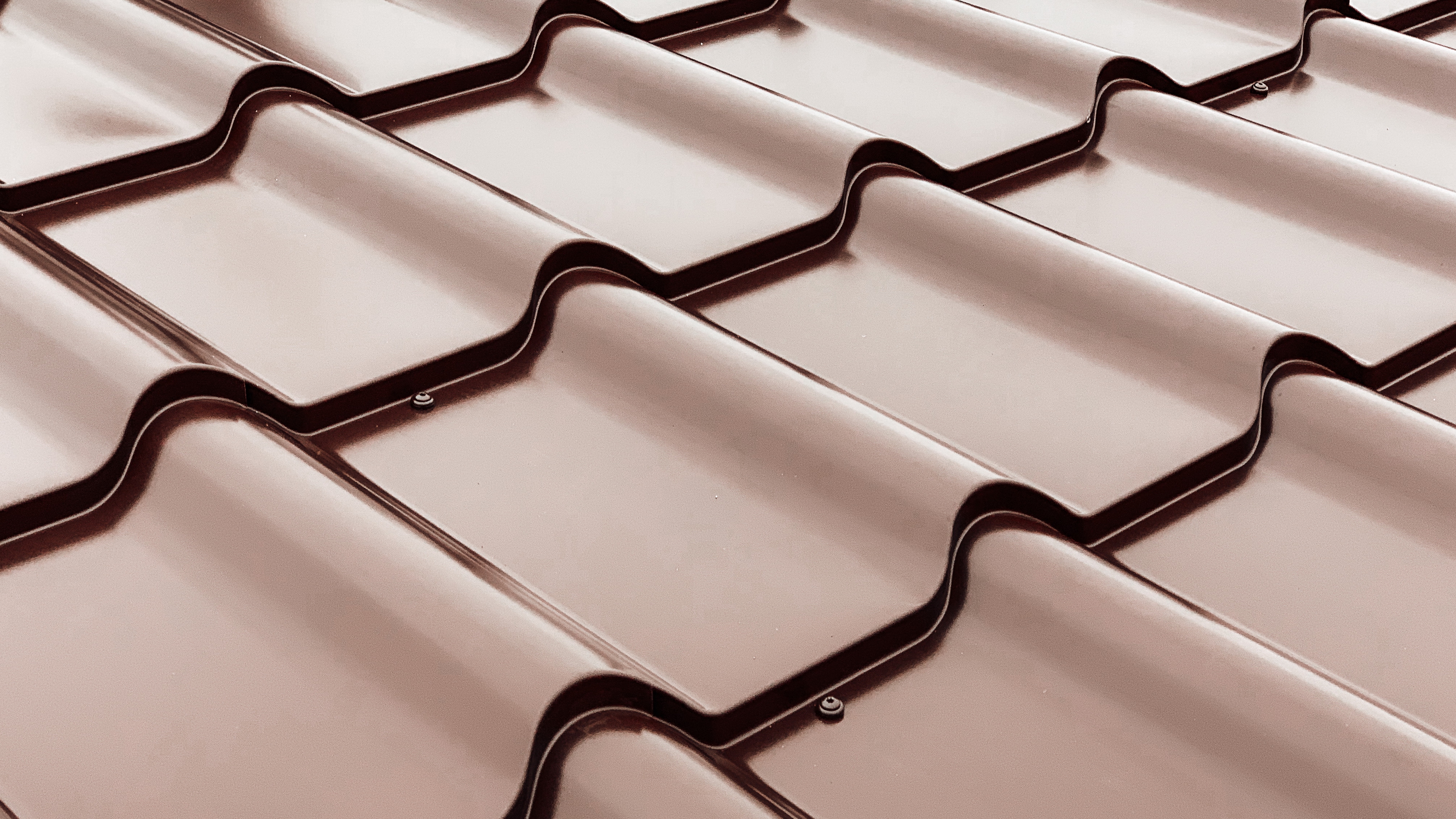 Description: A close up of a metal roof with a brown tint finish and a wavy pattern of wavy lines.