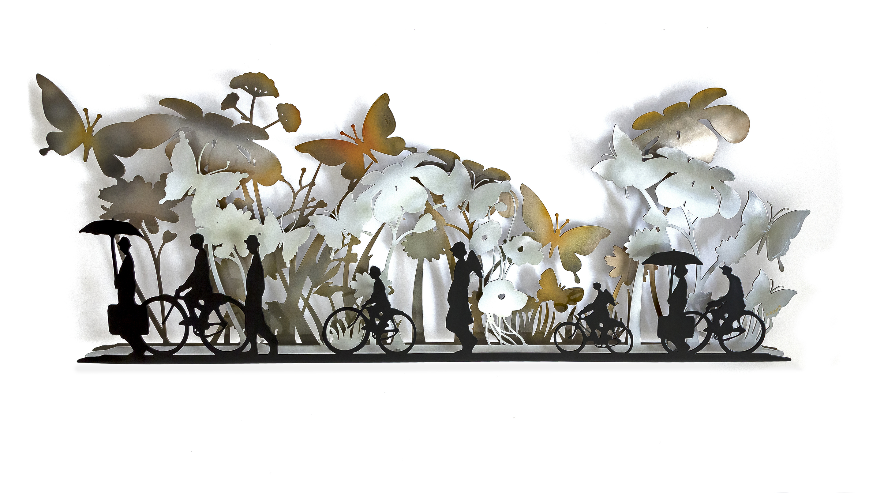 Description: A metal sculpture of a group of people riding bicycles and butterflies with a white background and a white background.
