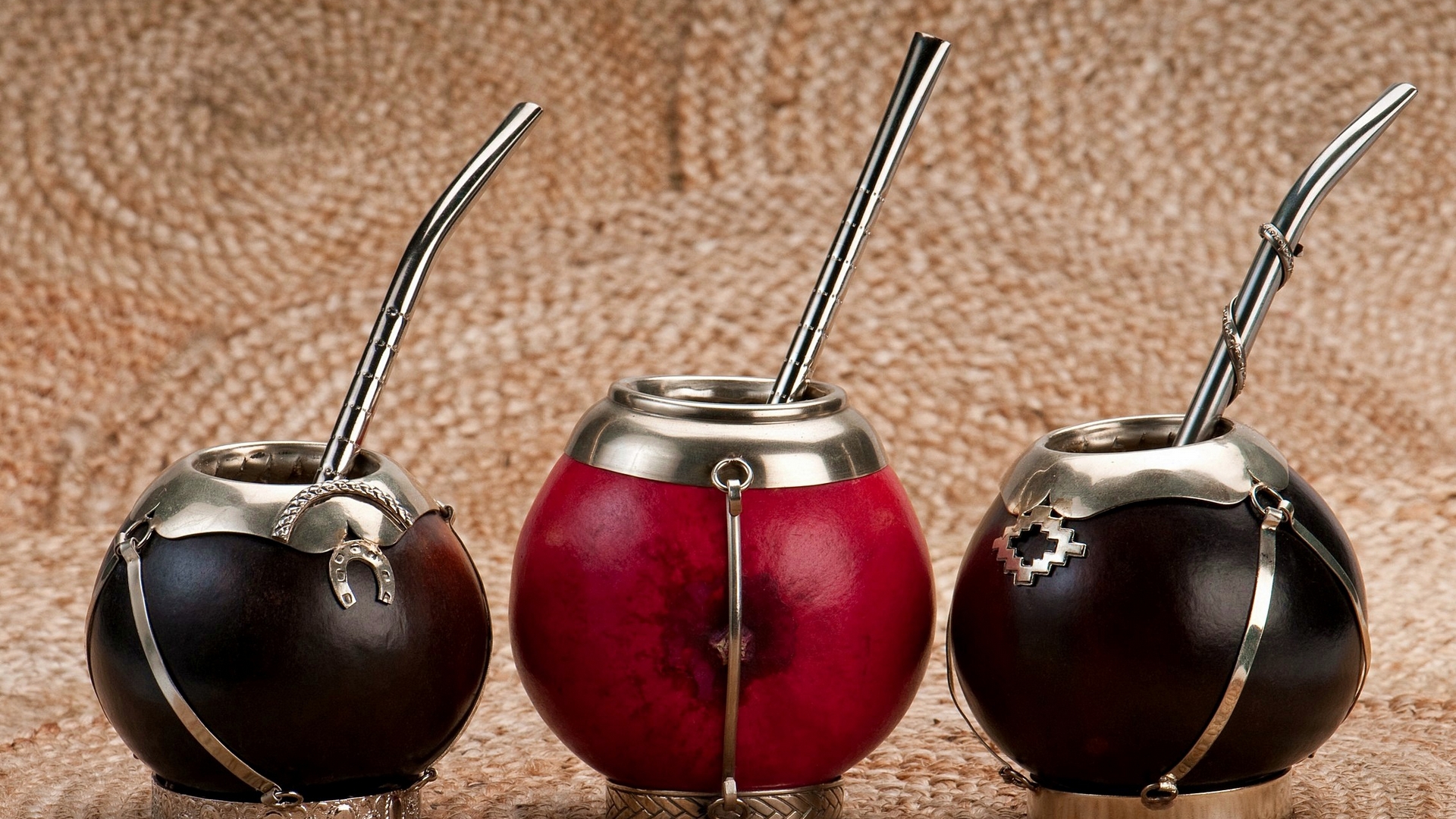 Description: Three metal vases with metal handles and handles on a table top with a brown background and a brown cloth.