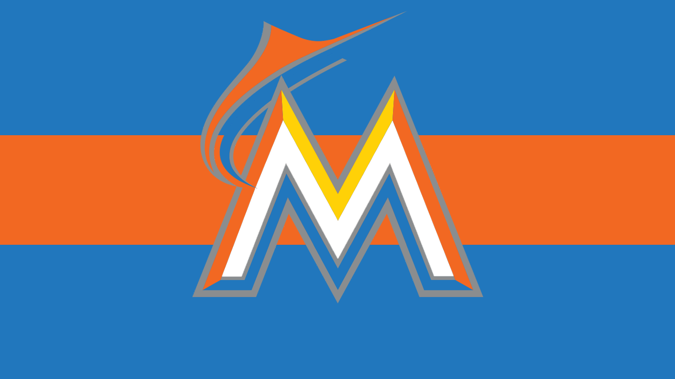 Description: A logo of the miami marlins on a blue and orange background with a white and orange stripe and a blue and orange strip.