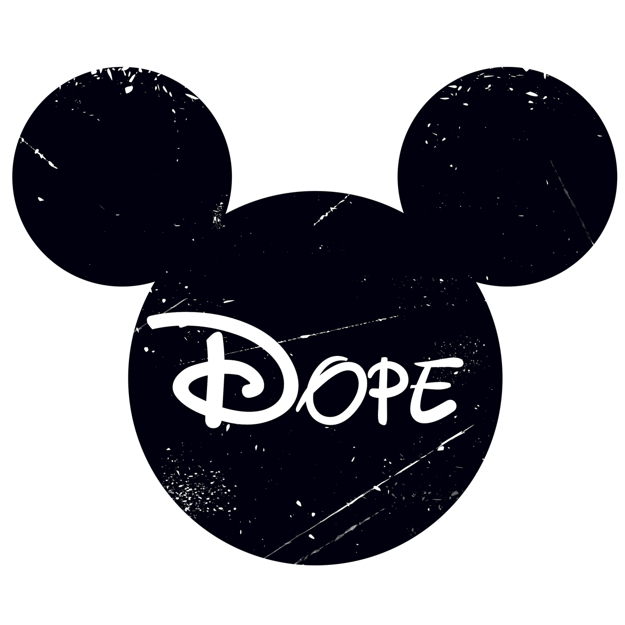 Description: A mickey mouse with the word dope on it's face and a black and white background with a white outline.