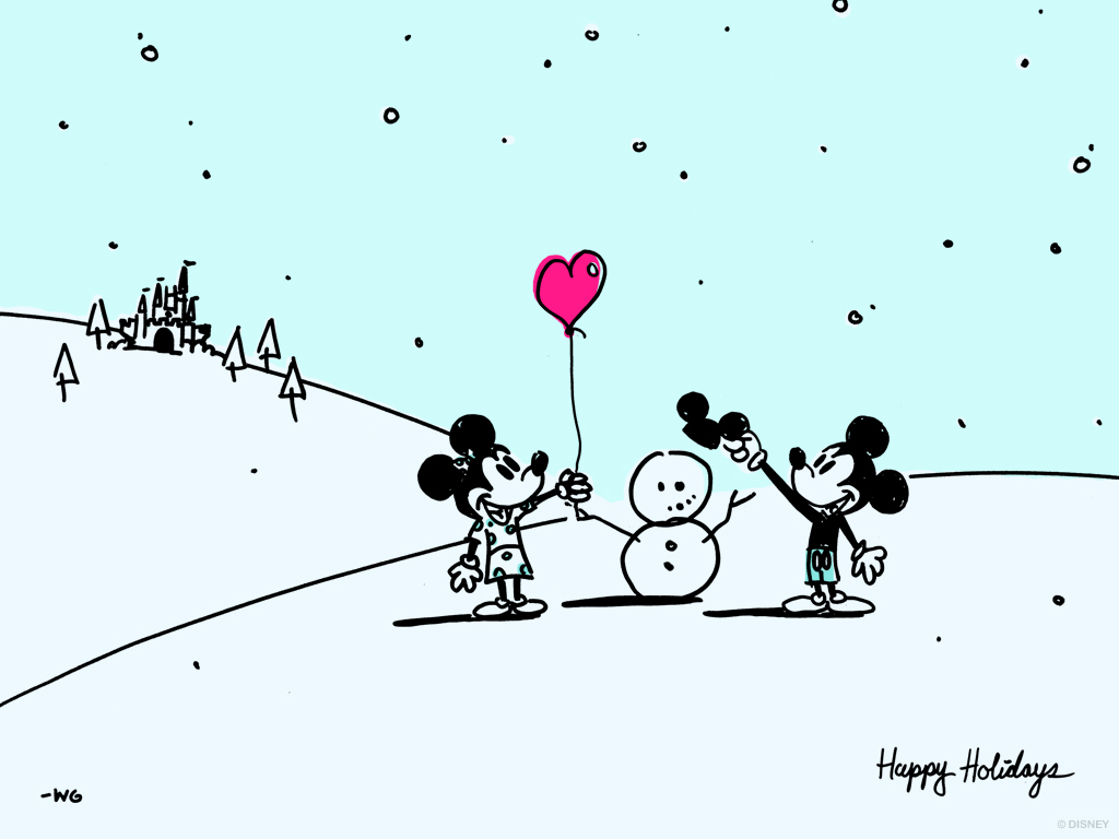 Description: A couple of mickey mouses holding a heart balloon in the snow with a snowman and a snowman.