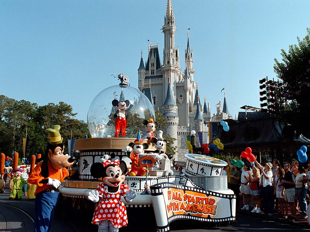 Description: A parade float with mickey mouse and mickey mouse in front of a castle with people in costume and in front of it.
