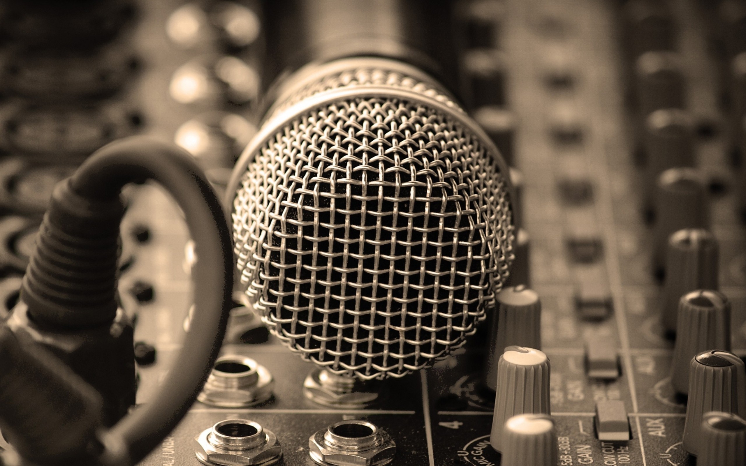 Description: A microphone and a sound board with knobs and knobs on it's sides and a pair of glasses on the side.