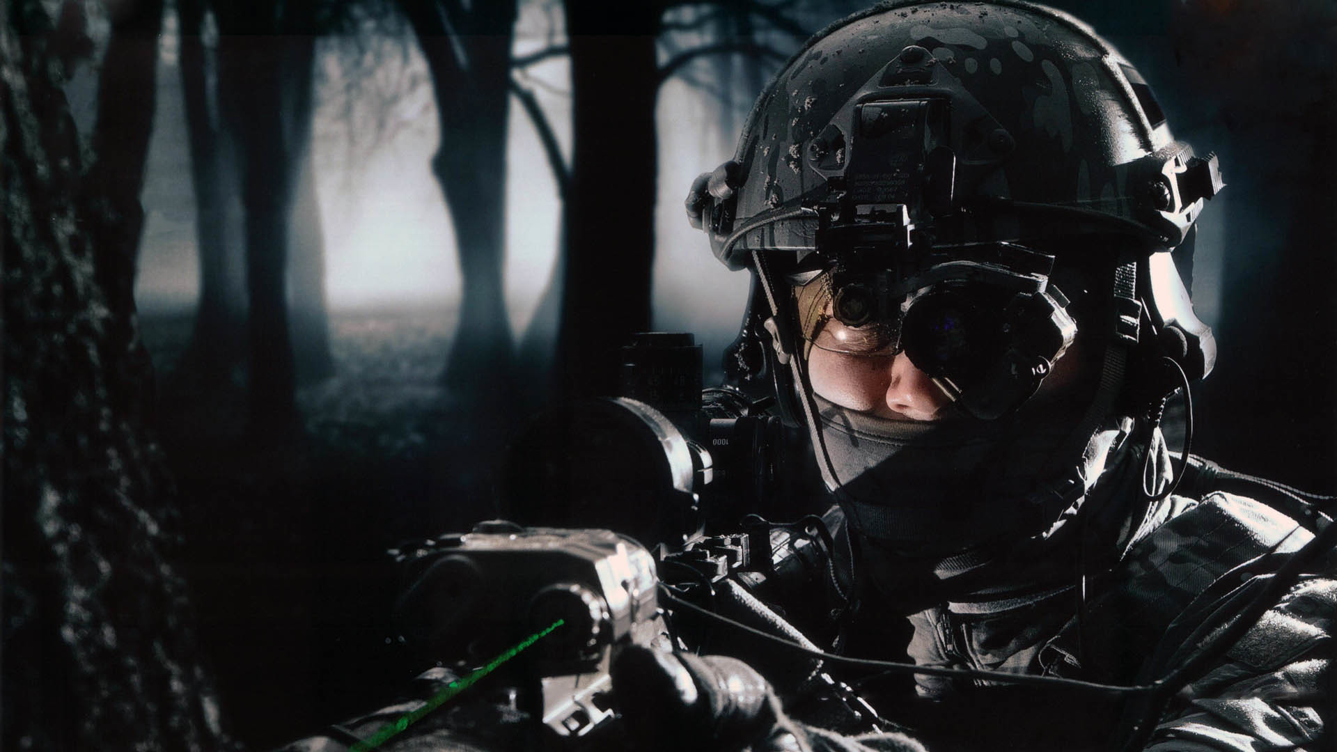 Description: A man in a military uniform holding a gun in a forest with trees in the background and fog in the air.