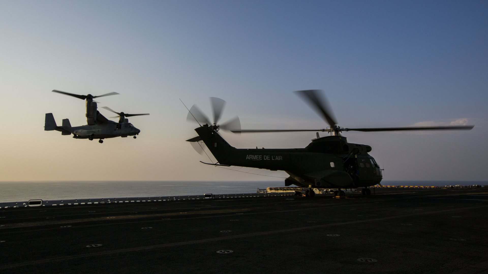 Description: Two military helicopters flying over a ship in the ocean at sunset or dawn with a helicopter landing on the deck.