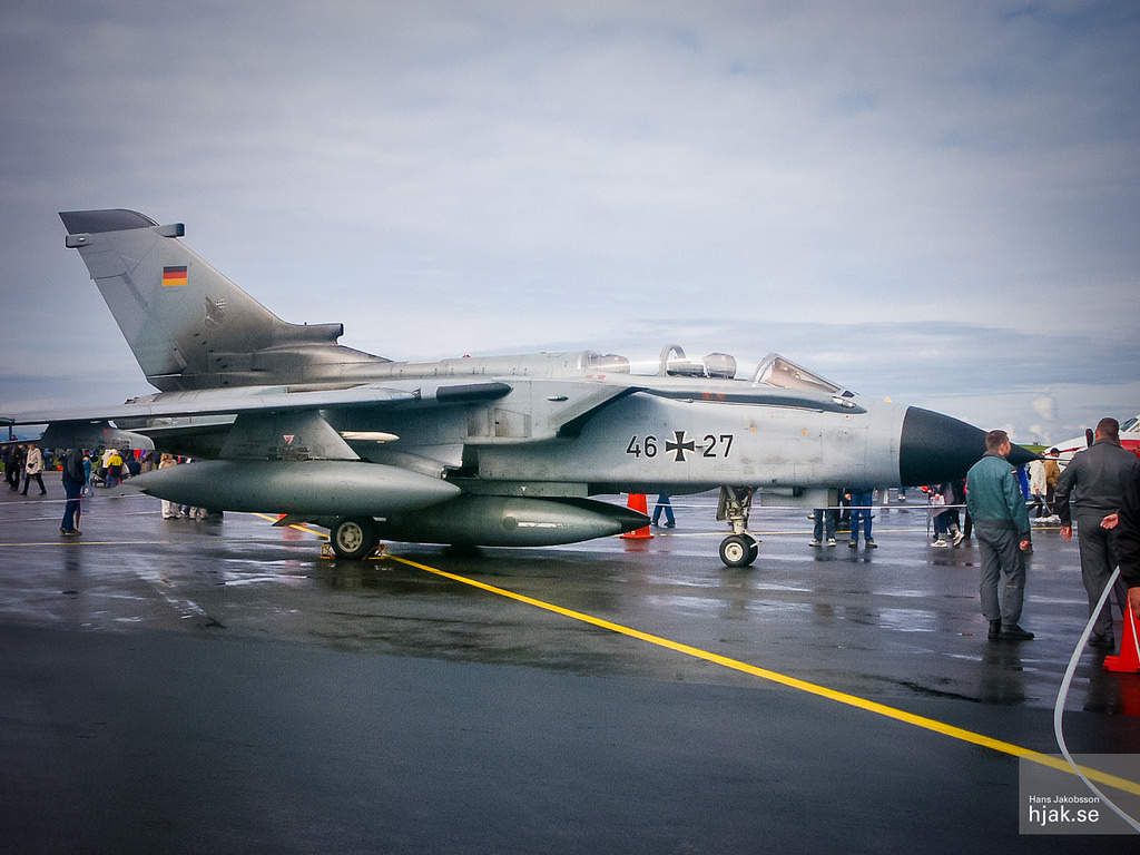 Description: A military jet sitting on top of an airport runway next to people standing around it and looking at it.