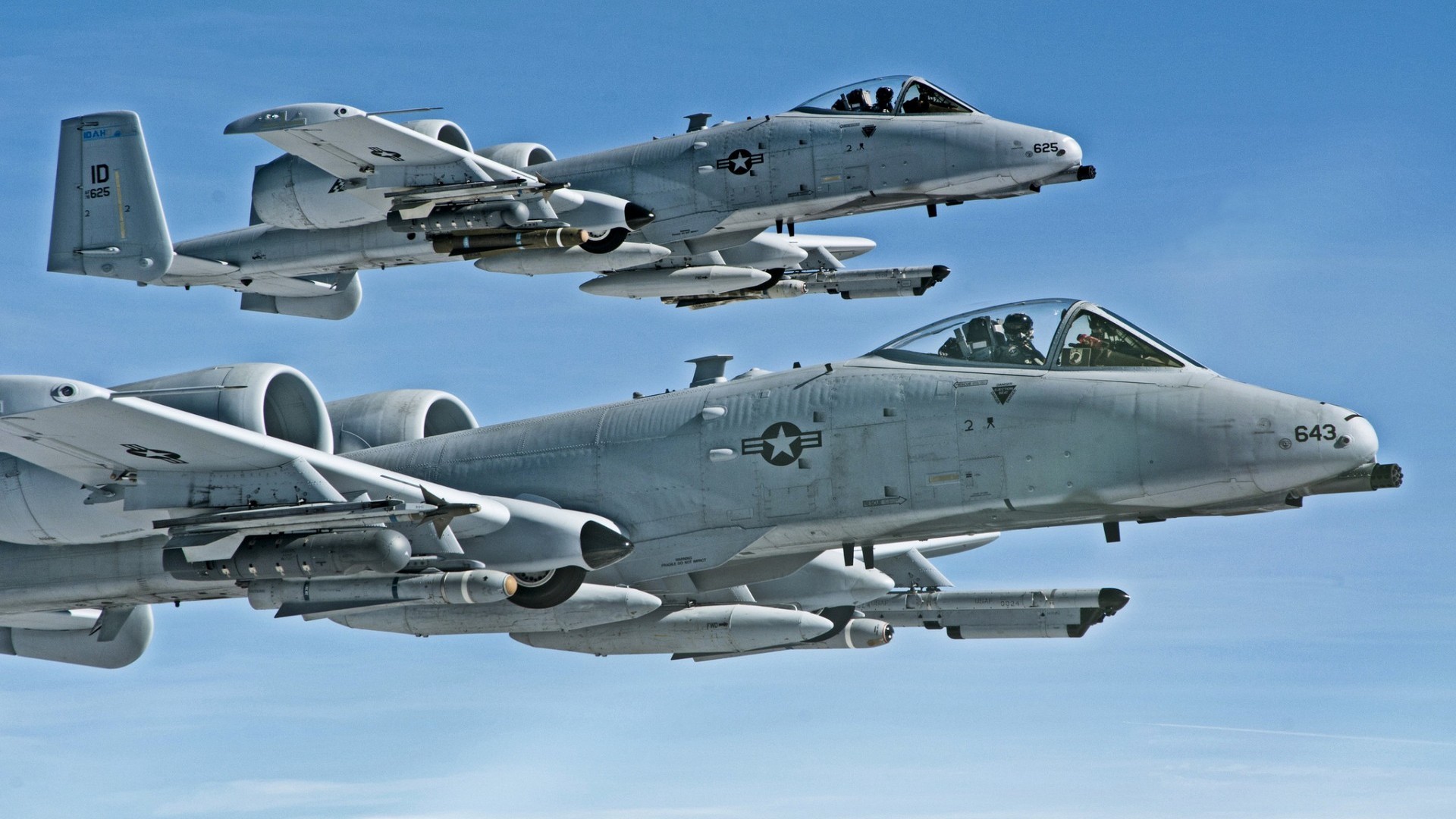 Description: Two military jets flying in the sky together in formation with each other in the air.