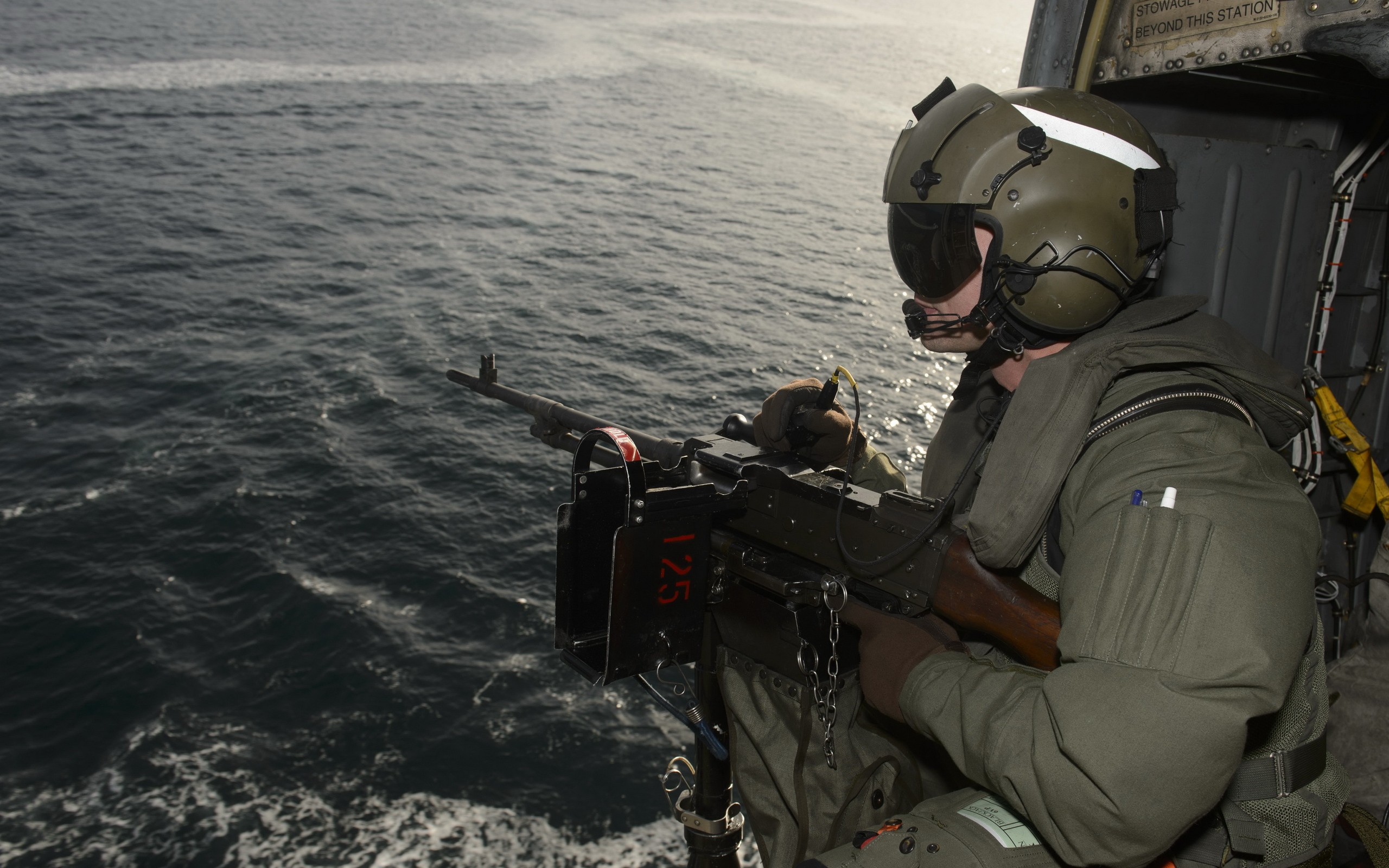 Description: A man in a military uniform holding a machine gun on a boat in the water with a boat in the background.
