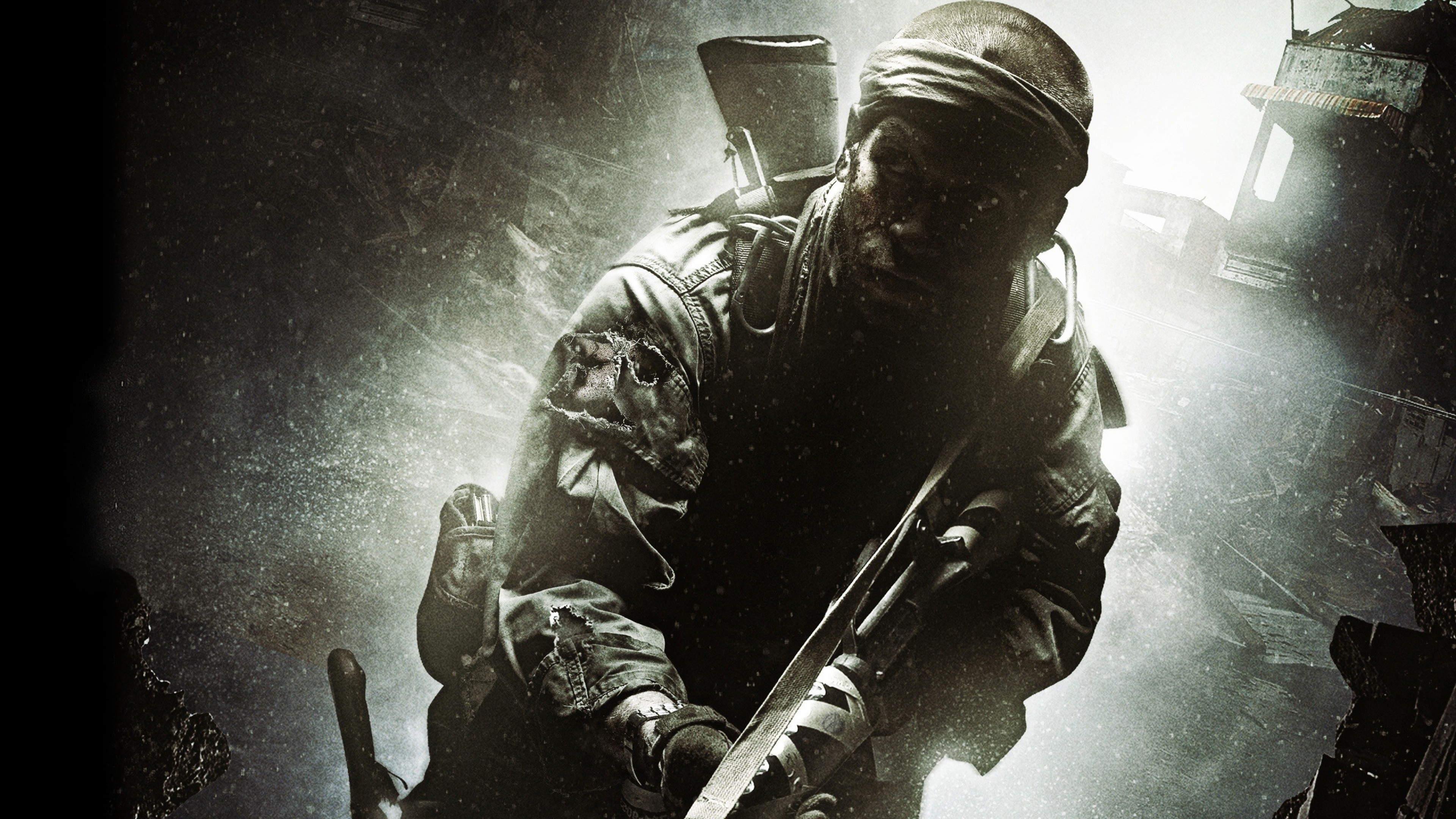 Description: A man in a military uniform holding a knife and a knife in his hand in a dark room with a light coming from behind him.