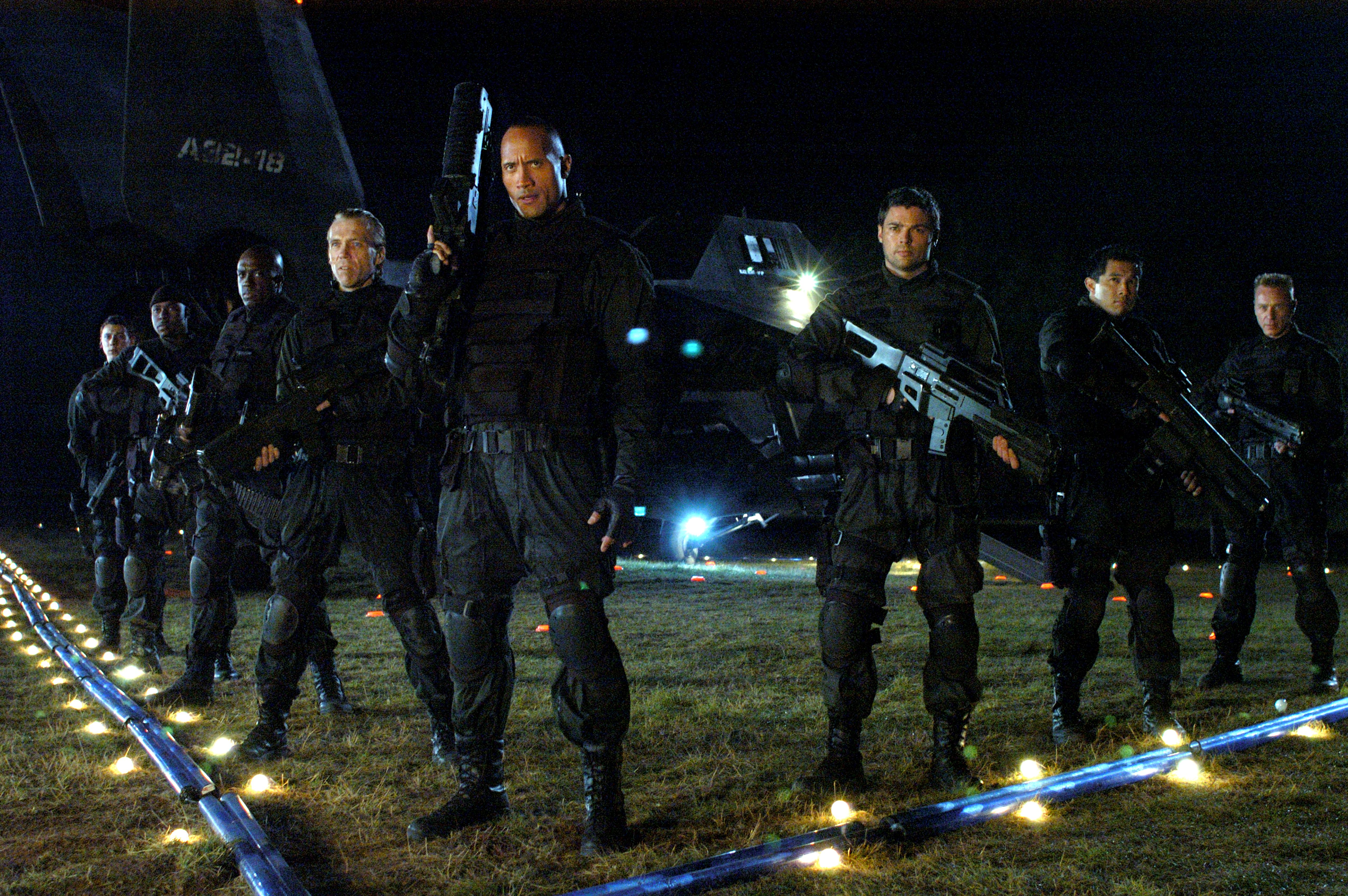 Description: A group of men in military uniforms walking down a field at night with a helicopter in the background and lights on the ground.