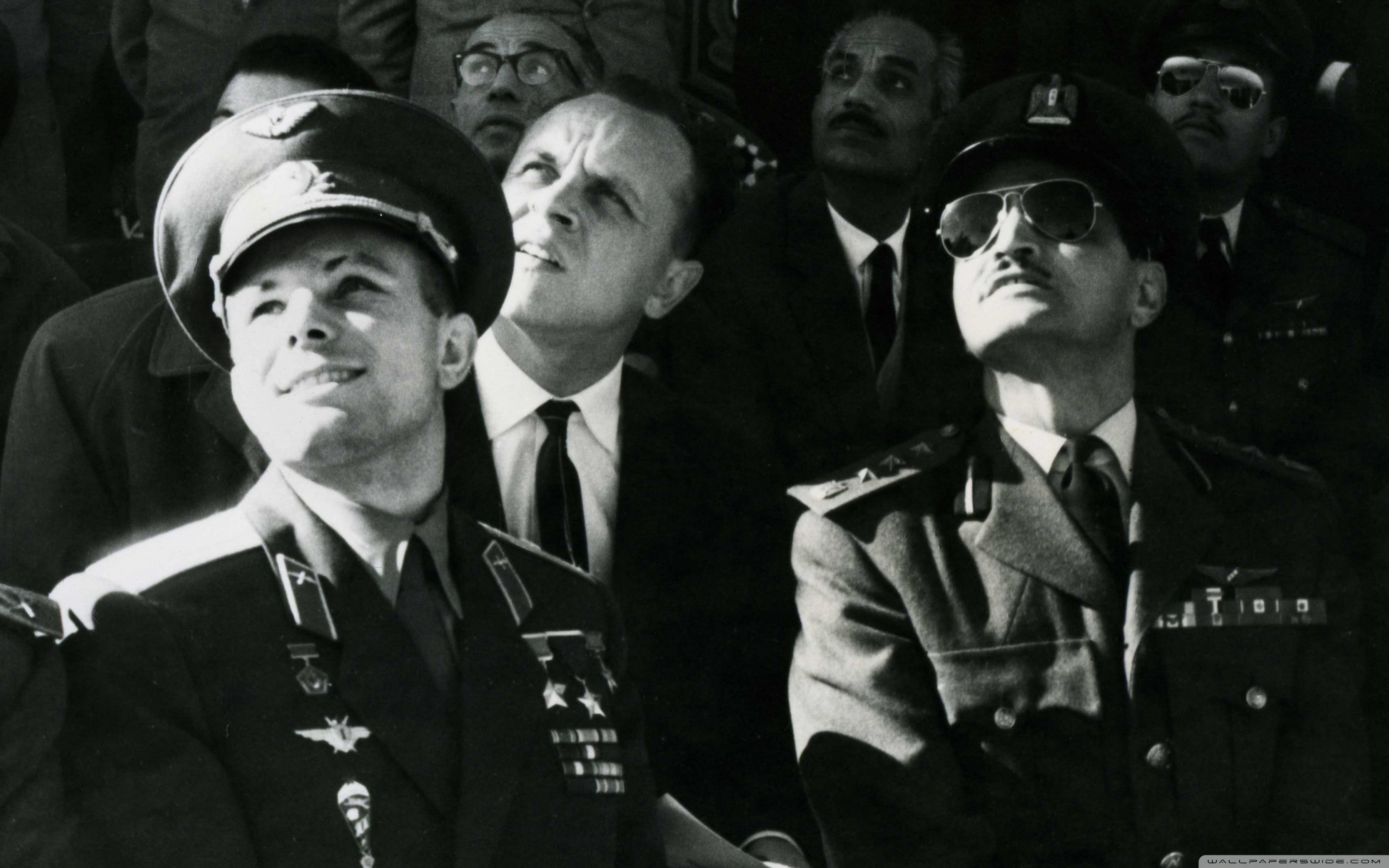 Description: A group of men in military uniforms sitting next to each other in front of a crowd of people wearing hats.