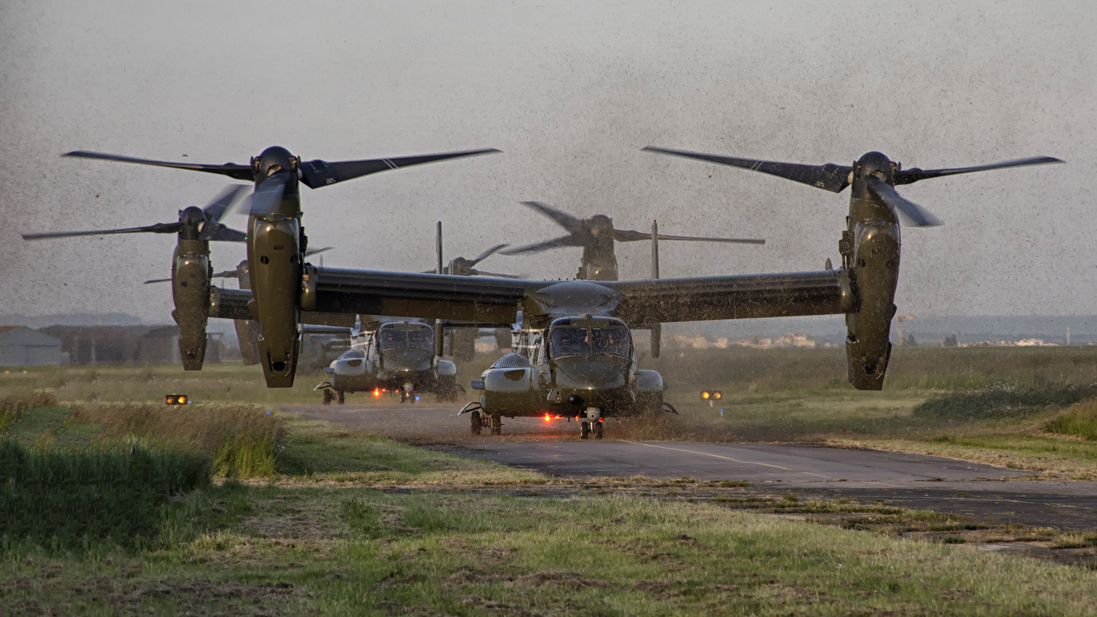 Description: A couple of military planes flying over a field of grass and dirt with a person standing on the ground.