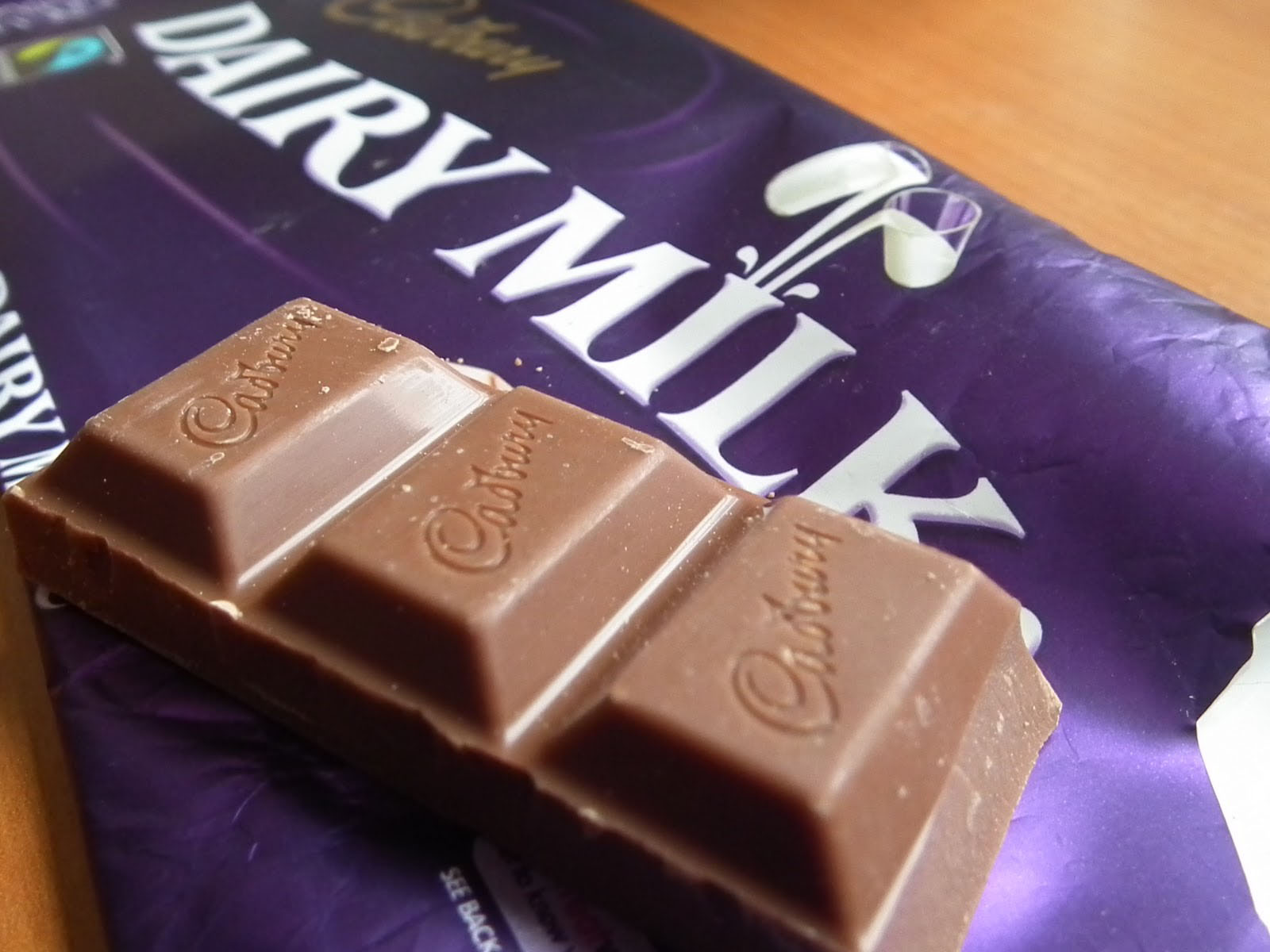 Description: A bar of milk chocolate sitting on top of a table next to a bag of milk chocolates on a table.
