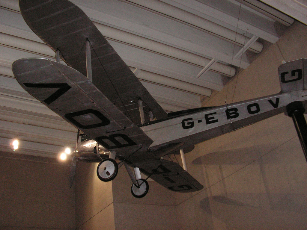 Description: A model airplane hanging from the ceiling of a museum exhibit room with a ceiling fan and a light fixture.