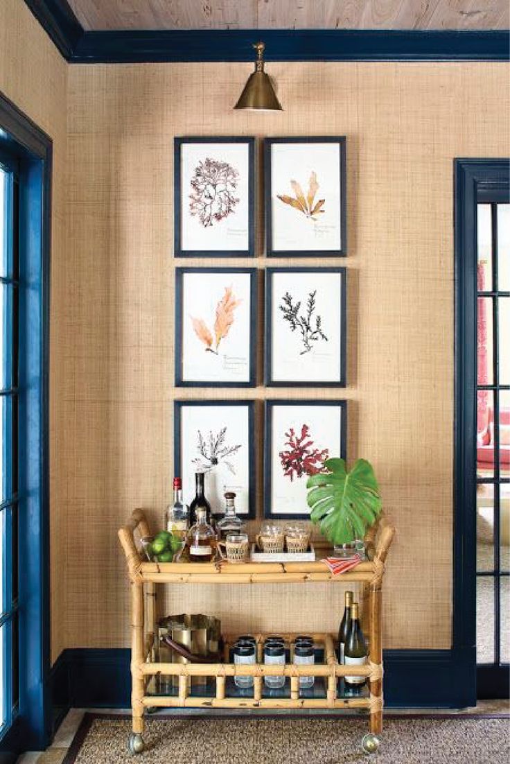 Description: A room with a table and pictures on the wall and a potted plant on the table in front of the window.