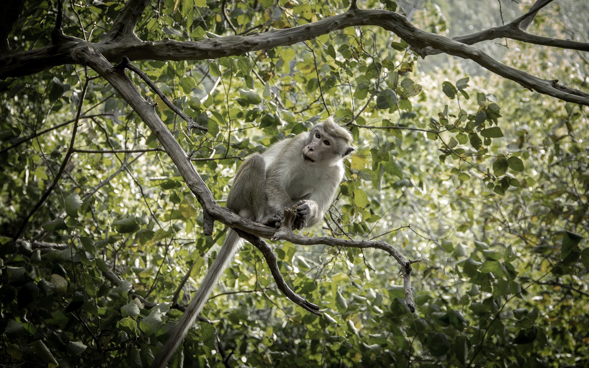 Description: A monkey sitting on a tree branch in a forest area with lots of leaves and branches around it.