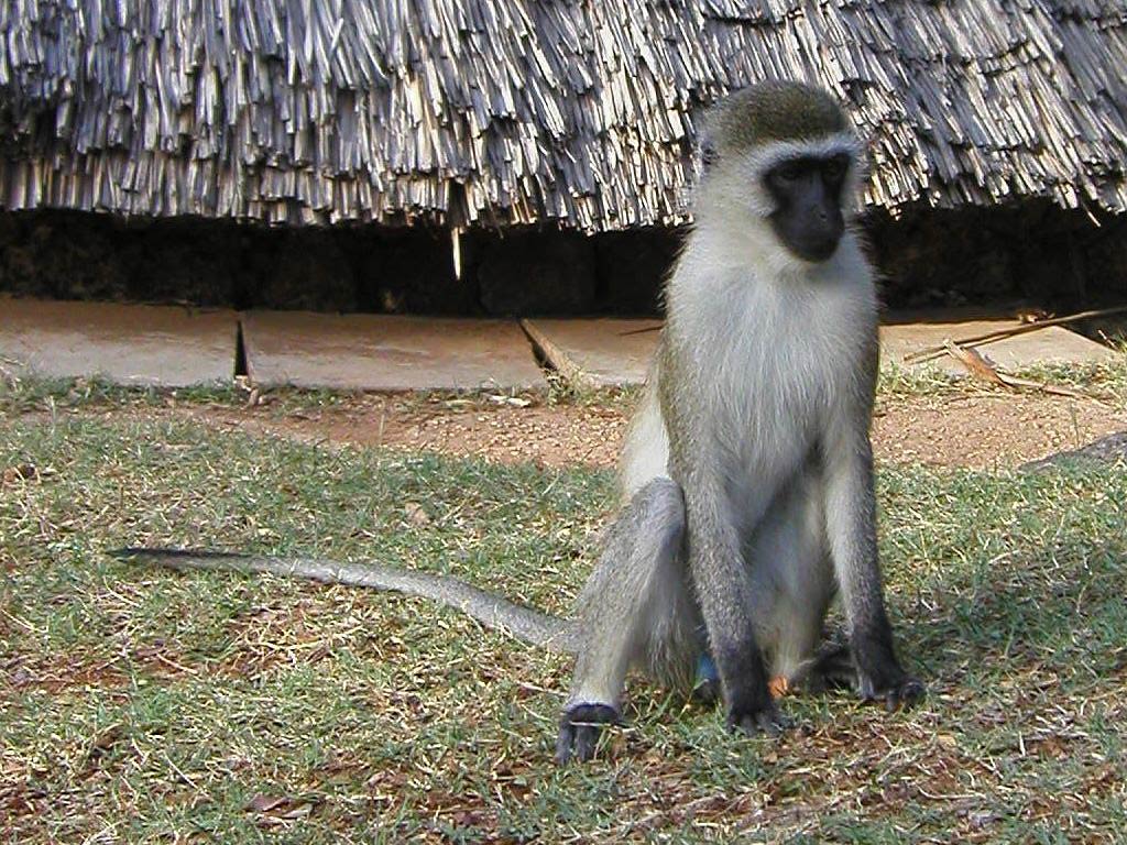 Description: A monkey sitting on the ground in front of a hut with grass and straw roofing on it's roof.