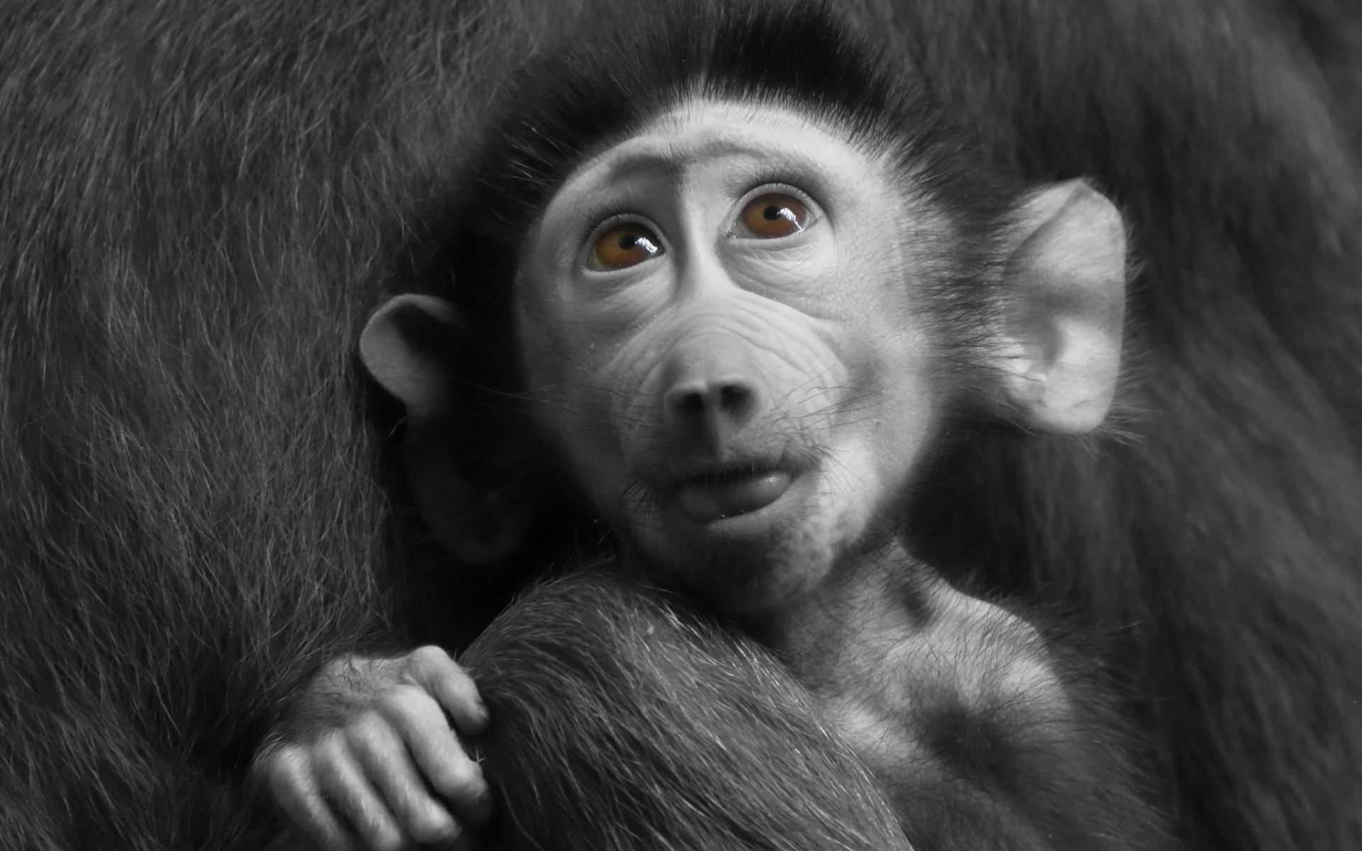 Description: A monkey with a surprised look on its face and a big furry coat on its back.