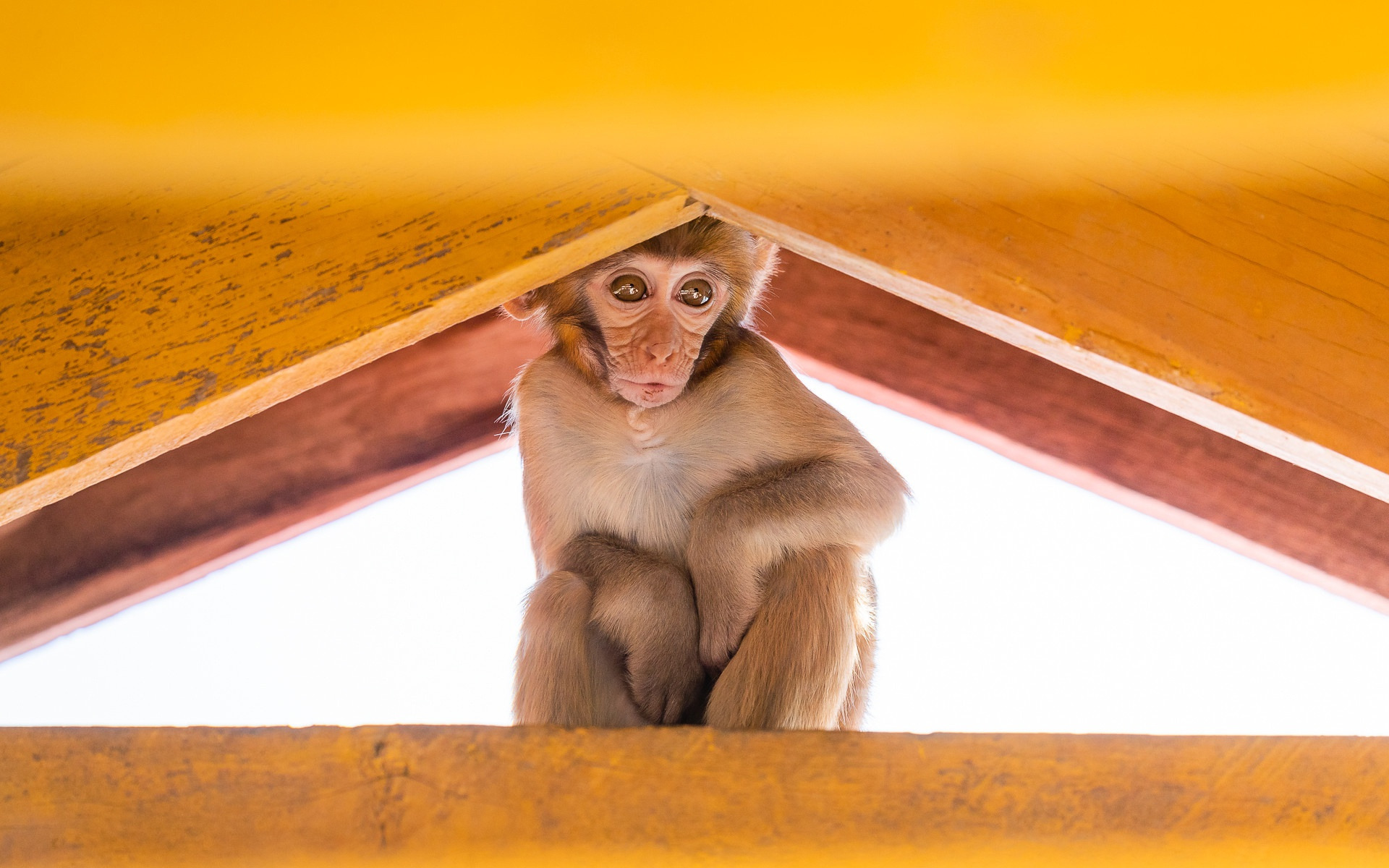 Description: A monkey sitting on a wooden roof looking at the camera with a curious look on its face and eyes.