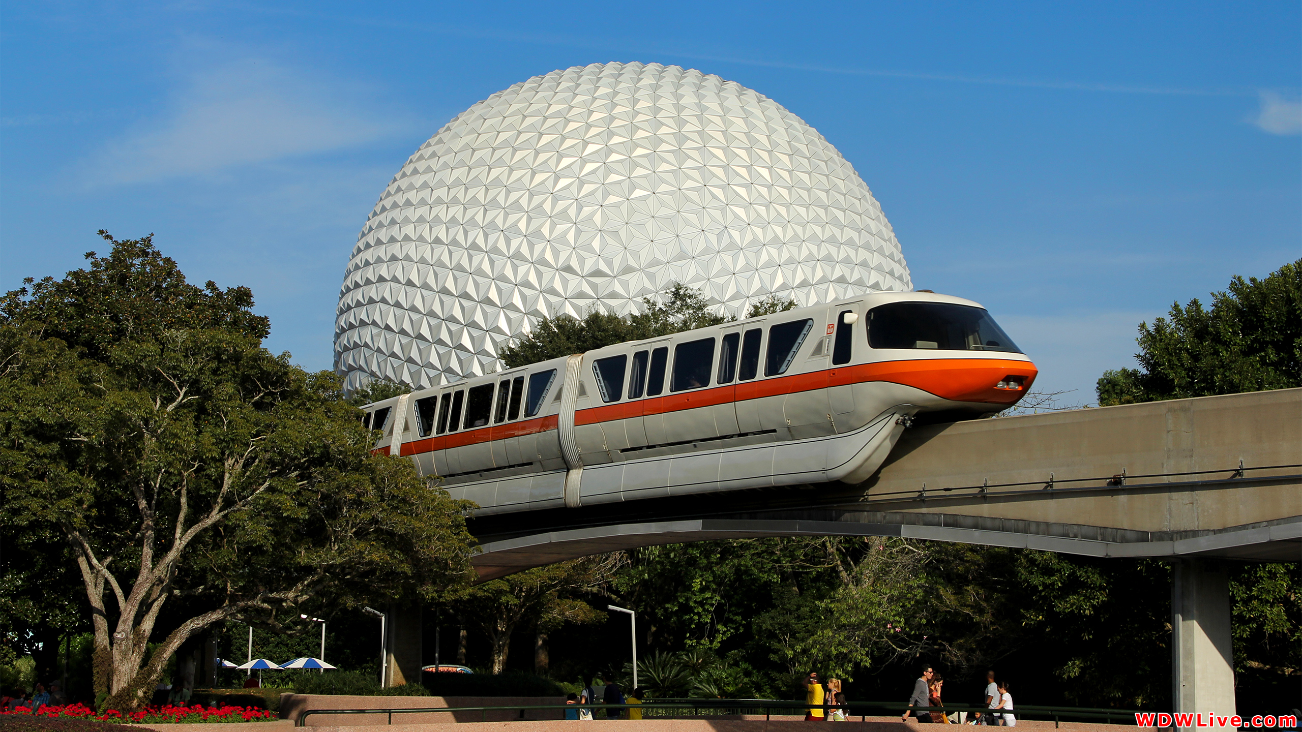 Description: A monorail train passing by a large ball structure in the background with people walking around it and trees in the foreground.
