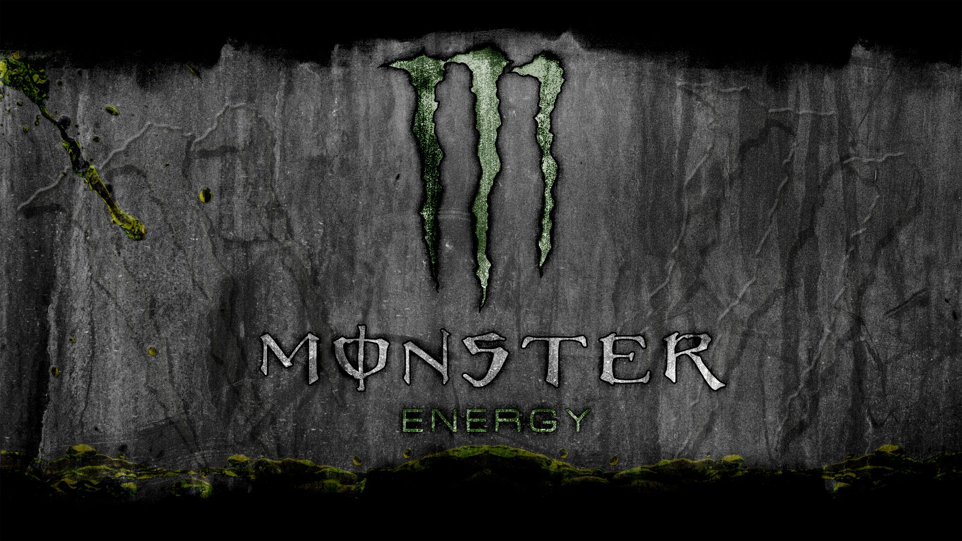 Description: A monster energy logo on a wall with mossy paint and a green monster logo on it's side.