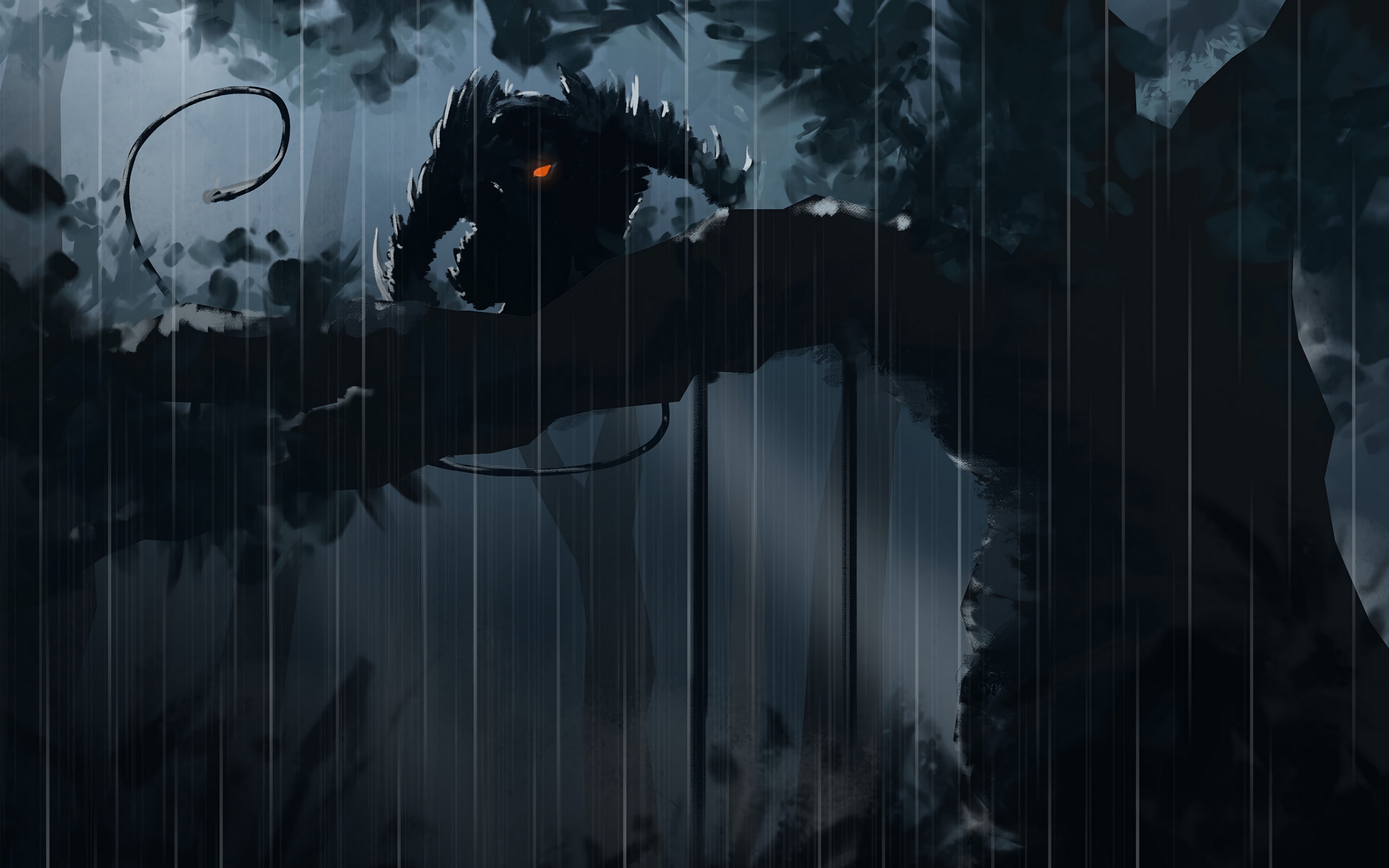 Description: A monster with glowing eyes standing in the rain in a forest with trees and branches.