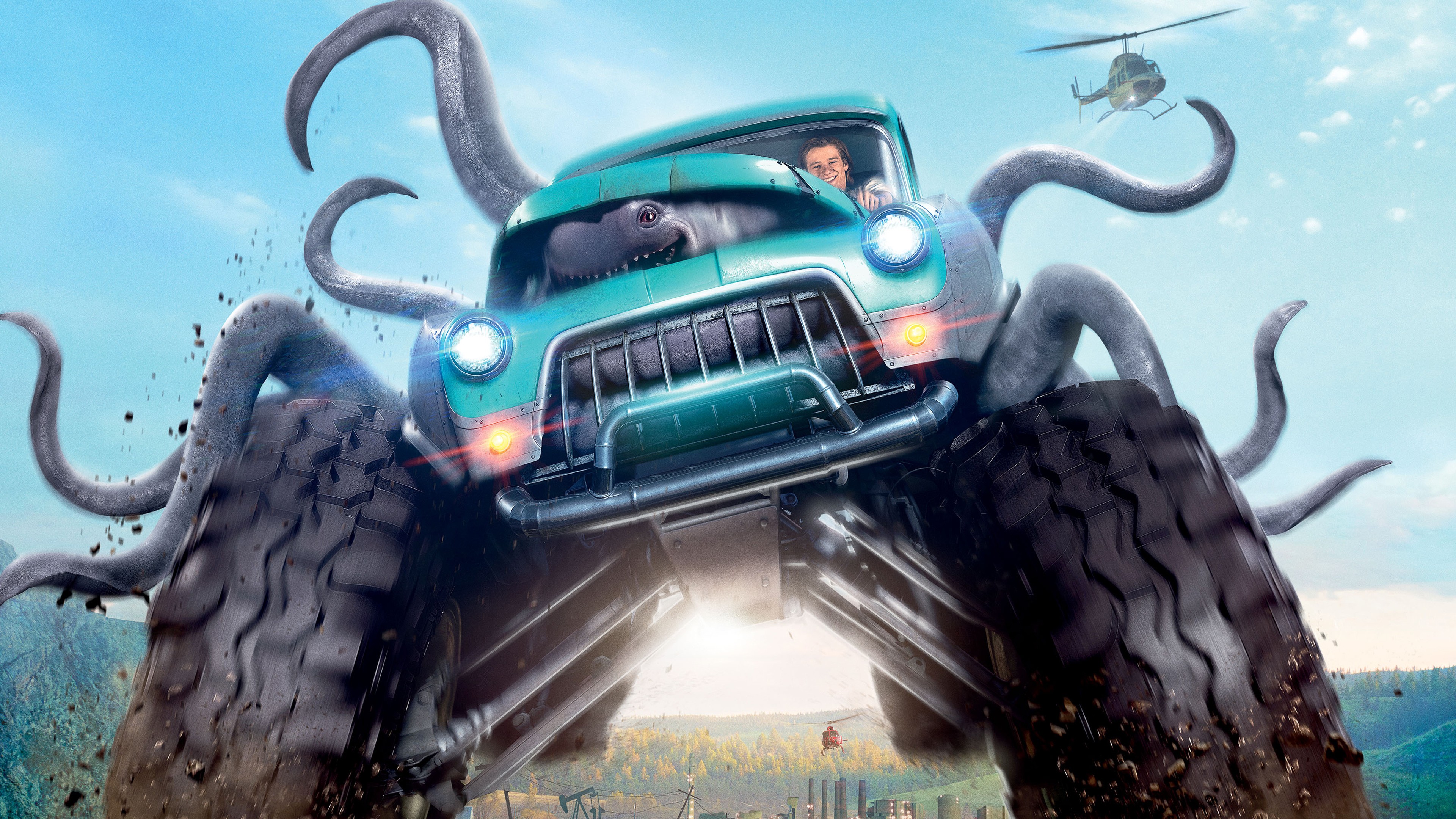Description: A monster truck with an octopus on the front of it is in the air with a helicopter flying above.