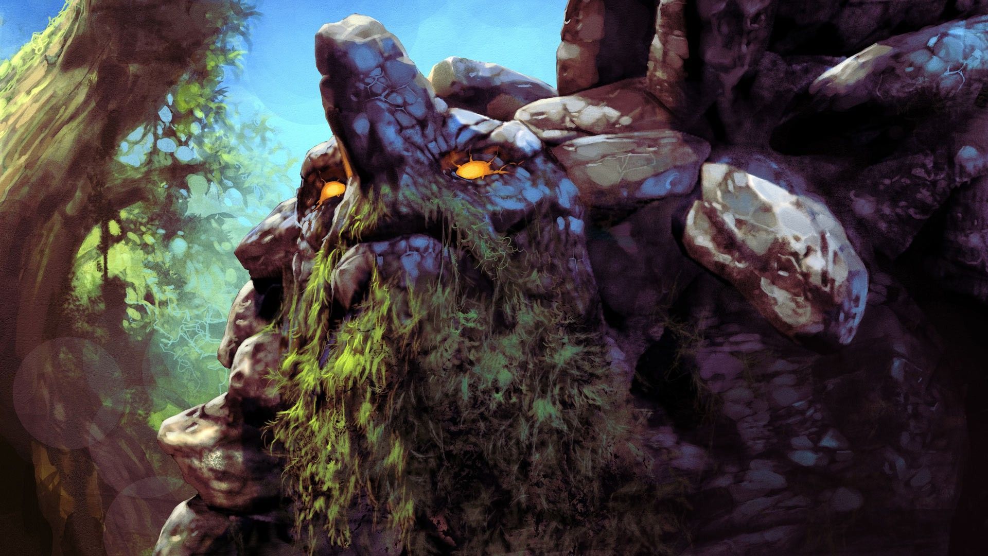 Description: A painting of a monster with a yellow eye in a forest with rocks and trees in the background and a blue sky.