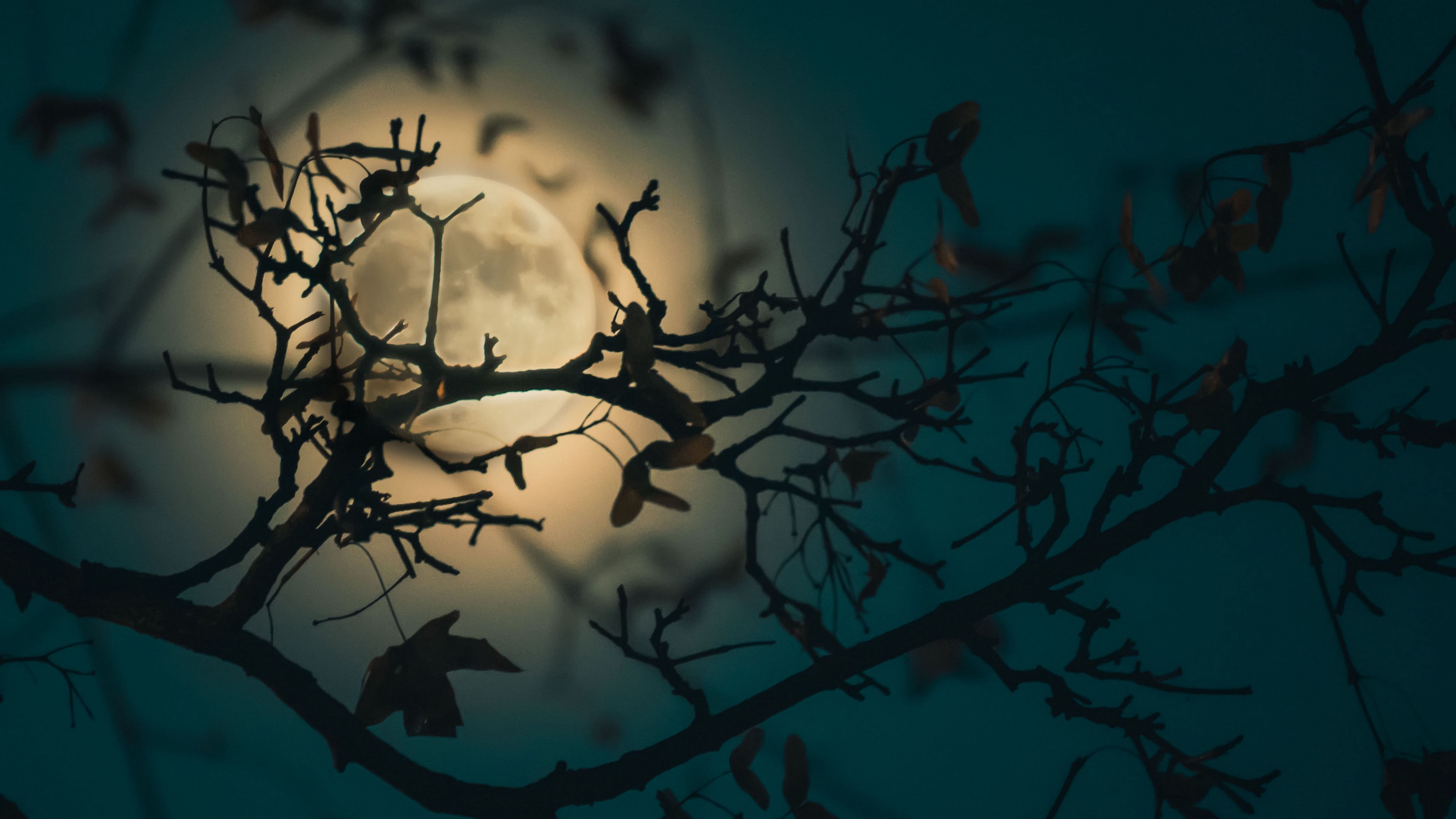 Description: A full moon is seen through the branches of a tree in the night sky with no leaves on it.